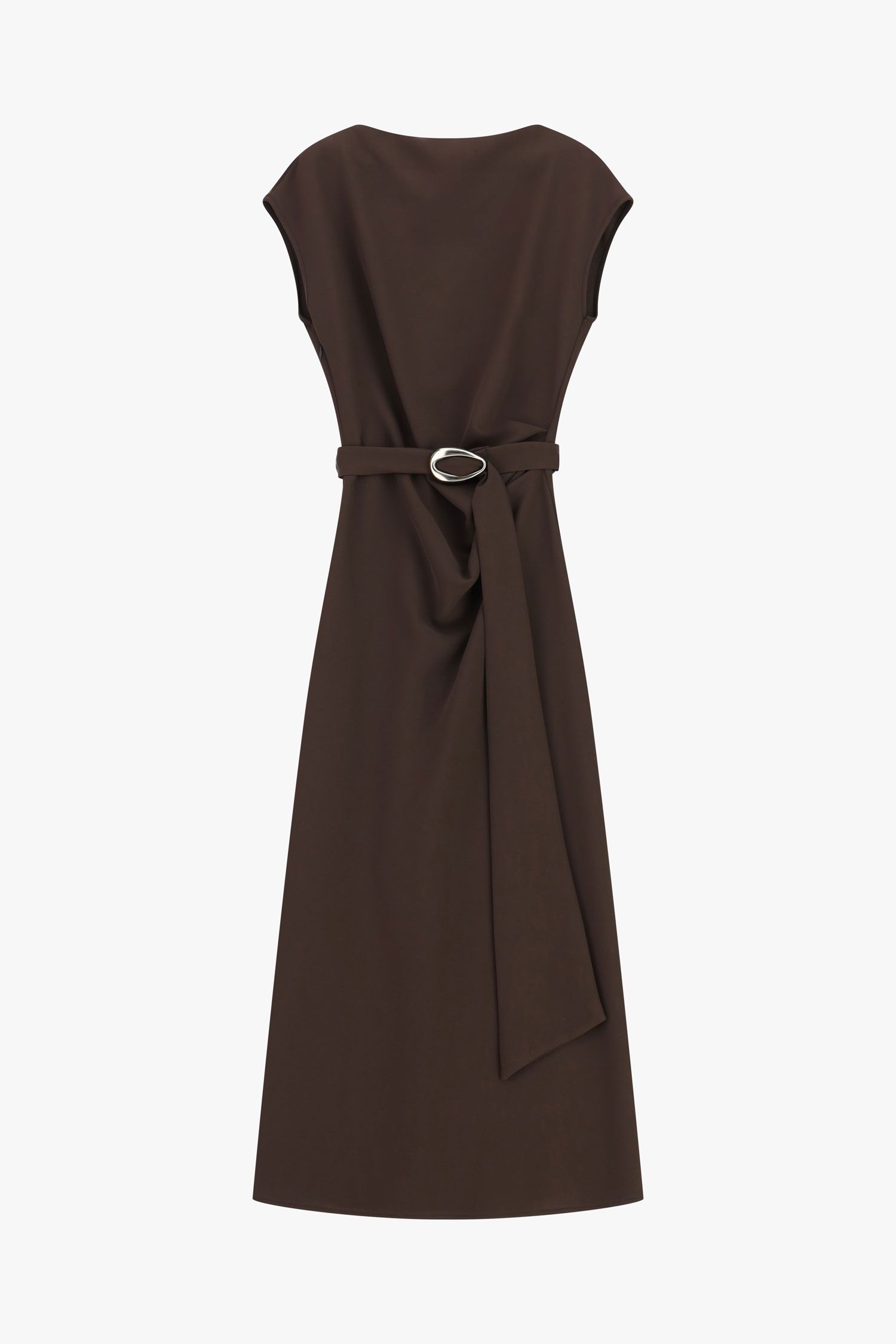 Scopri un vestito lungo che rappresenta l'essenza della sofisticazione metropolitana. Il design senza maniche abbinato a un scollo asimmetrico e una cintura in vita aggiunge un tocco di classe e raffinatezza. Perfetto per chi cerca un look distintivo che esprime individualità e buon gusto.