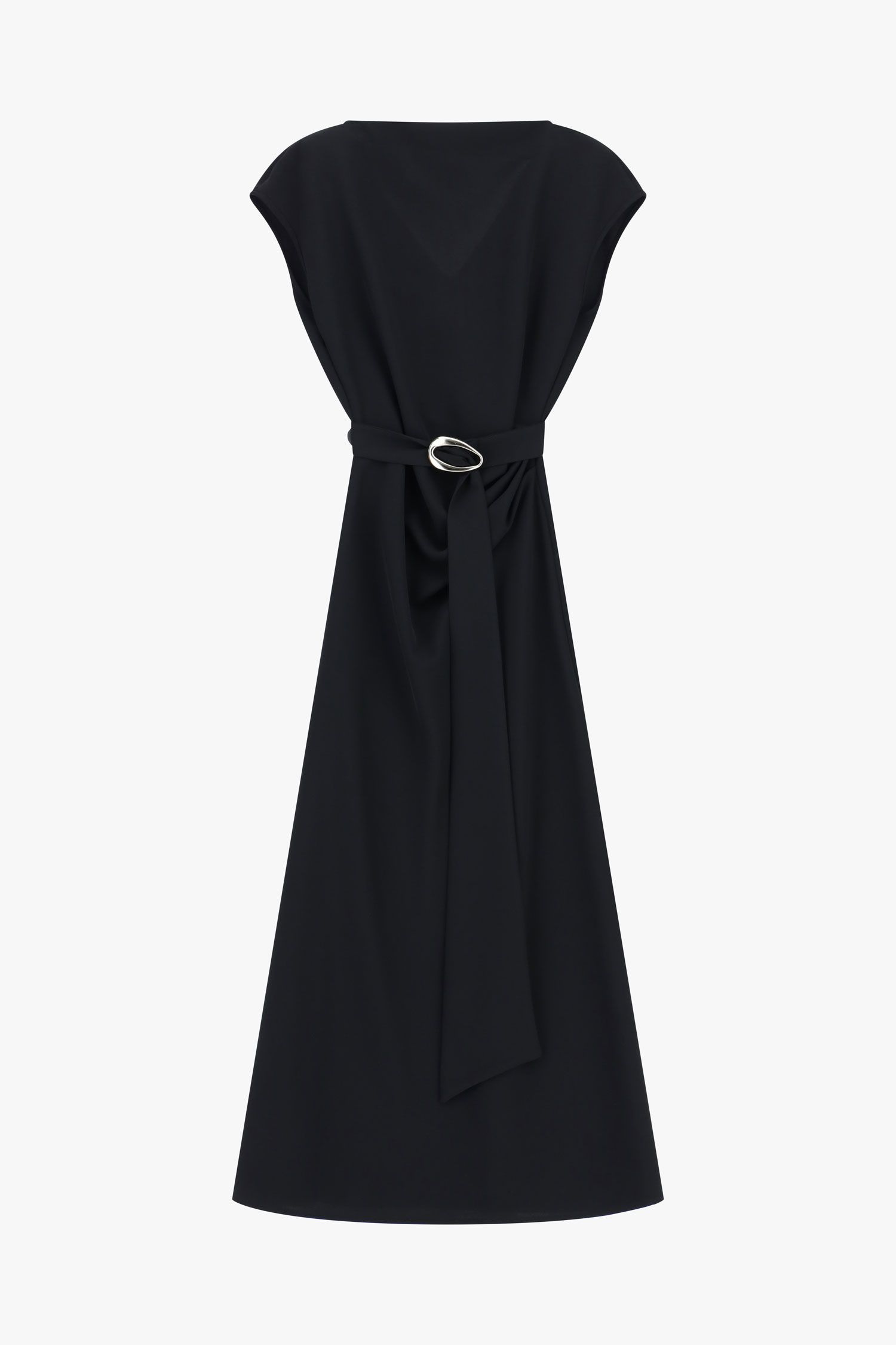 Scopri un vestito lungo che rappresenta l'essenza della sofisticazione metropolitana. Il design senza maniche abbinato a un scollo asimmetrico e una cintura in vita aggiunge un tocco di classe e raffinatezza. Perfetto per chi cerca un look distintivo che esprime individualità e buon gusto.
