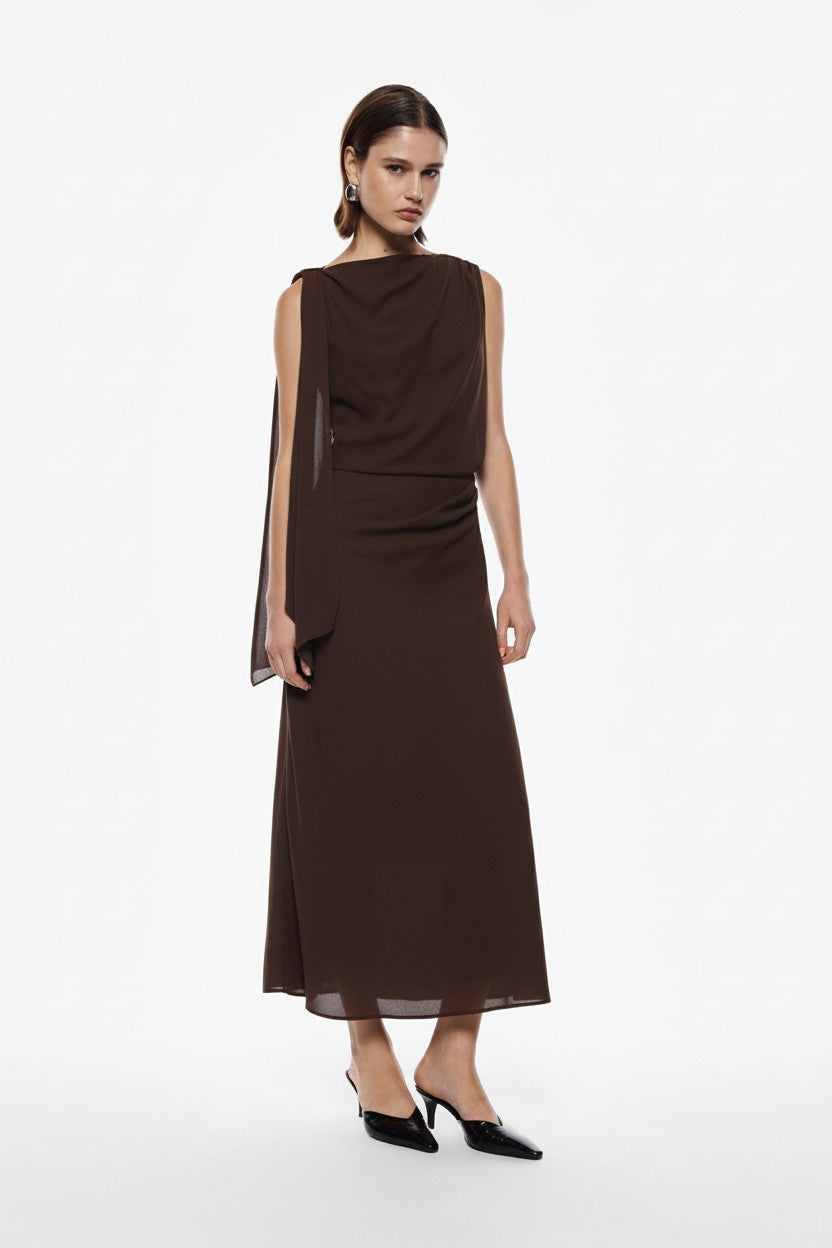Abito lungo caratterizzato da una manica lunga asimmetrica con apertura che dona dinamismo e movimento al design. Il taglio morbido e lo scollo a barca enfatizzano una silhouette decisa, perfetta per chi ricerca uno stile distintivo e contemporaneo nel proprio guardaroba.
