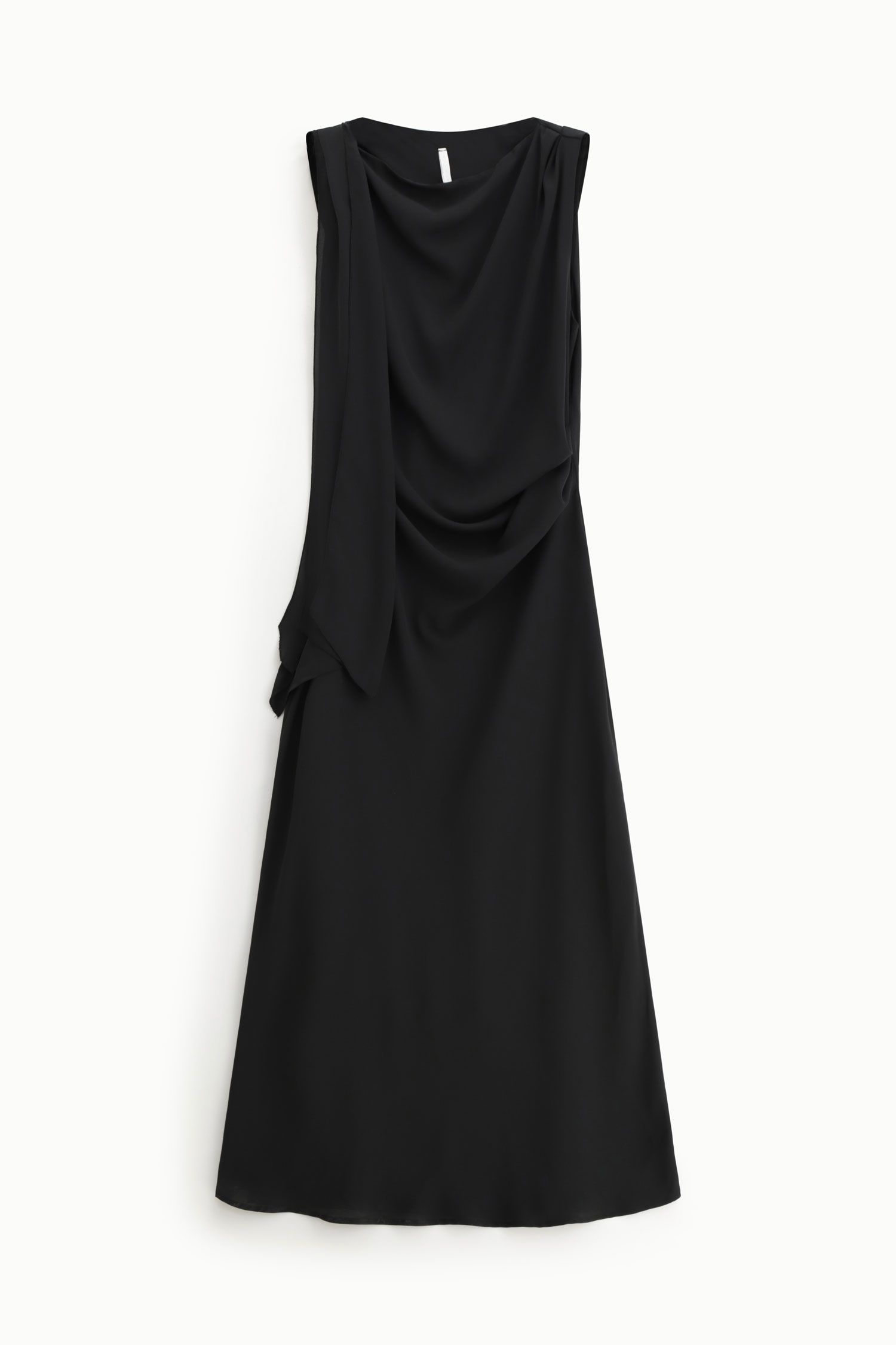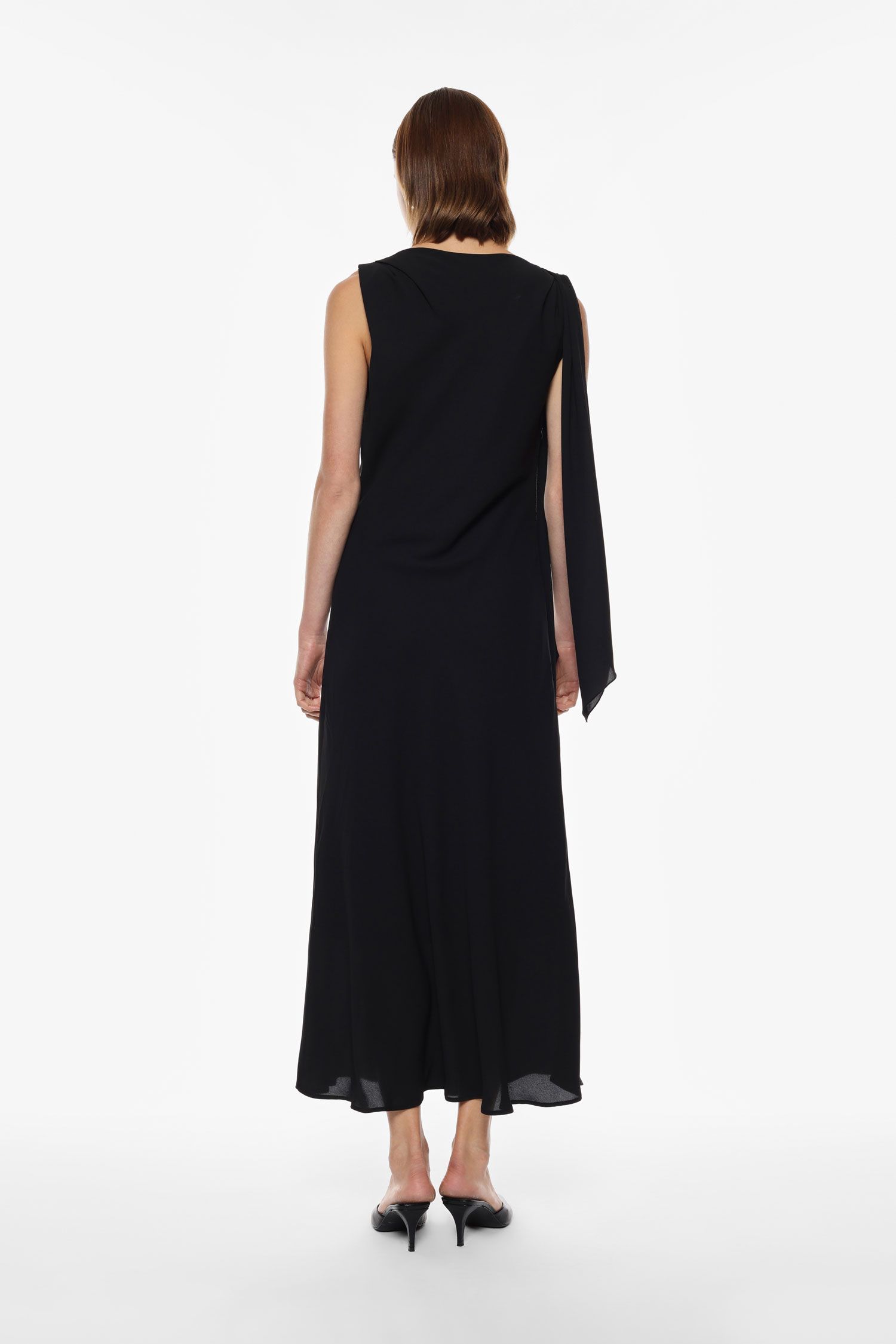 Abito lungo caratterizzato da una manica lunga asimmetrica con apertura che dona dinamismo e movimento al design. Il taglio morbido e lo scollo a barca enfatizzano una silhouette decisa, perfetta per chi ricerca uno stile distintivo e contemporaneo nel proprio guardaroba.