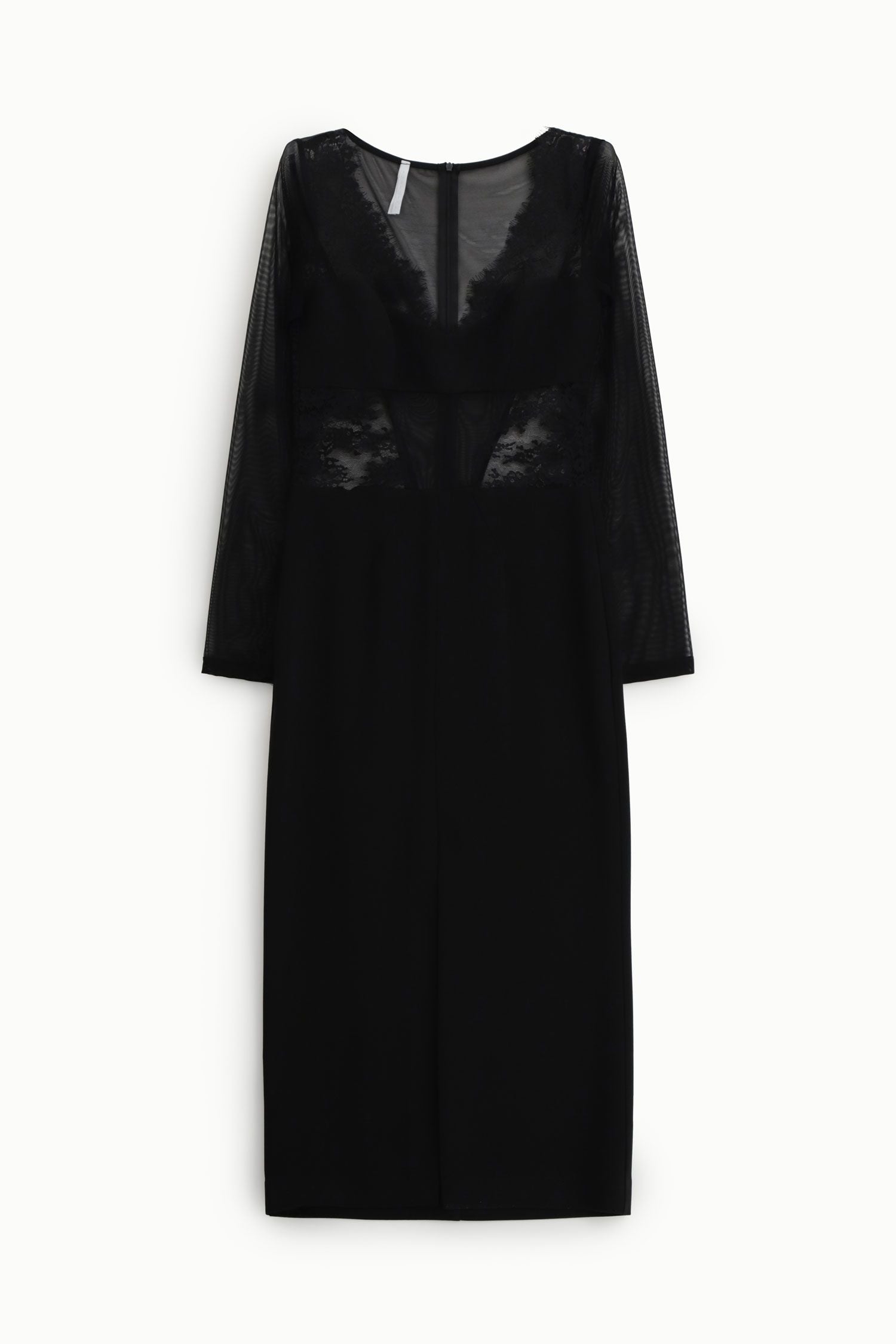 Abito midi dalla silhouette raffinata, impreziosito da maniche lunghe velate e dettagli in pizzo sul busto e in vita. La profonda scollatura a v dona carattere, mentre lo spacco anteriore aggiunge dinamismo. La chiusura a zip posteriore garantisce una vestibilità impeccabile e pratica.