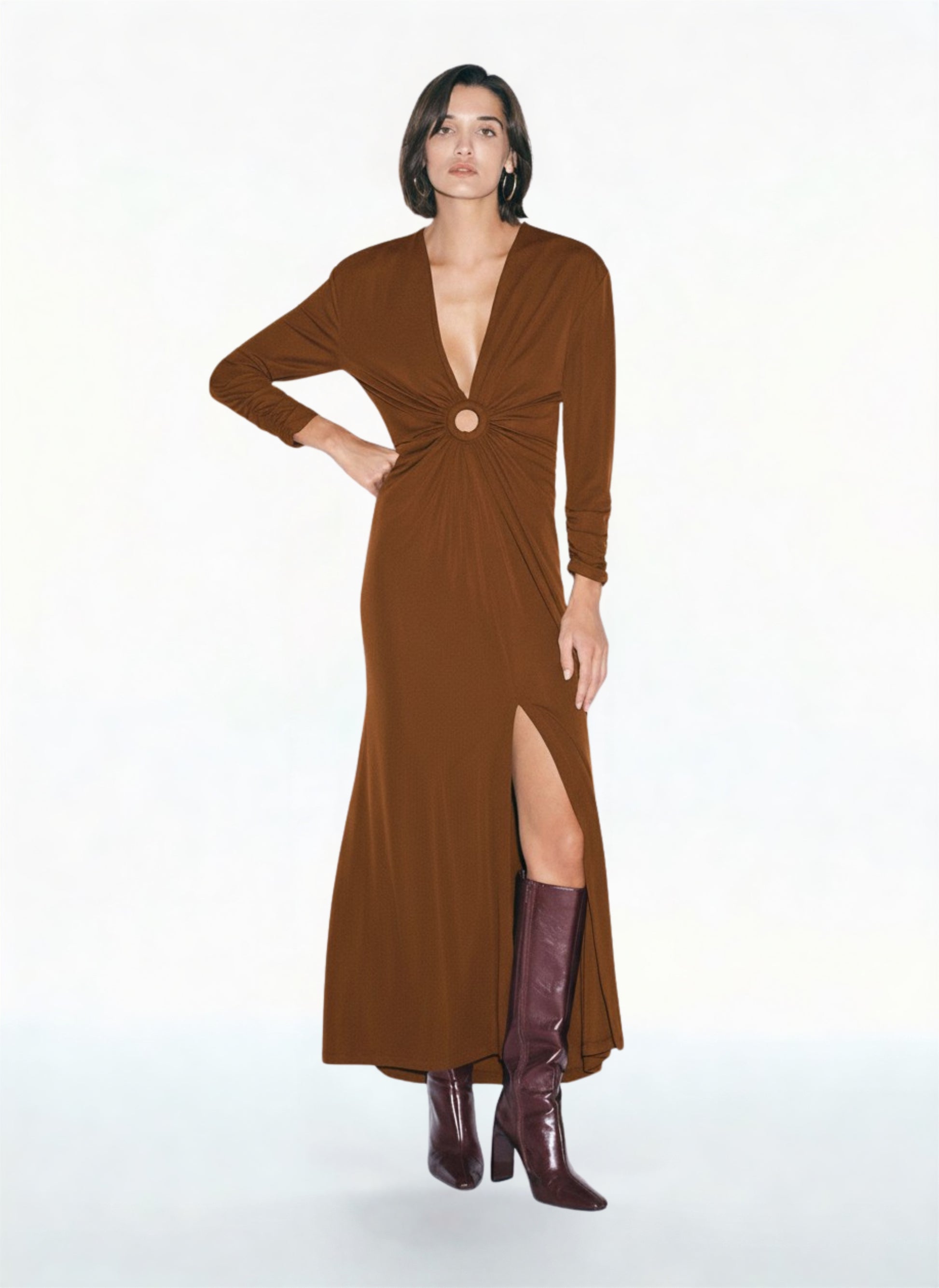 Abito lungo caratterizzato da una silhouette fluida, con maniche lunghe e profondo scollo a v. Il dettaglio ad anello centrale crea un drappeggio raffinato, mentre lo spacco anteriore aggiunge movimento. Ideale per chi desidera interpretare la propria individualità con un capo distintivo, perfetto in un guardaroba orientato alla contemporaneità.