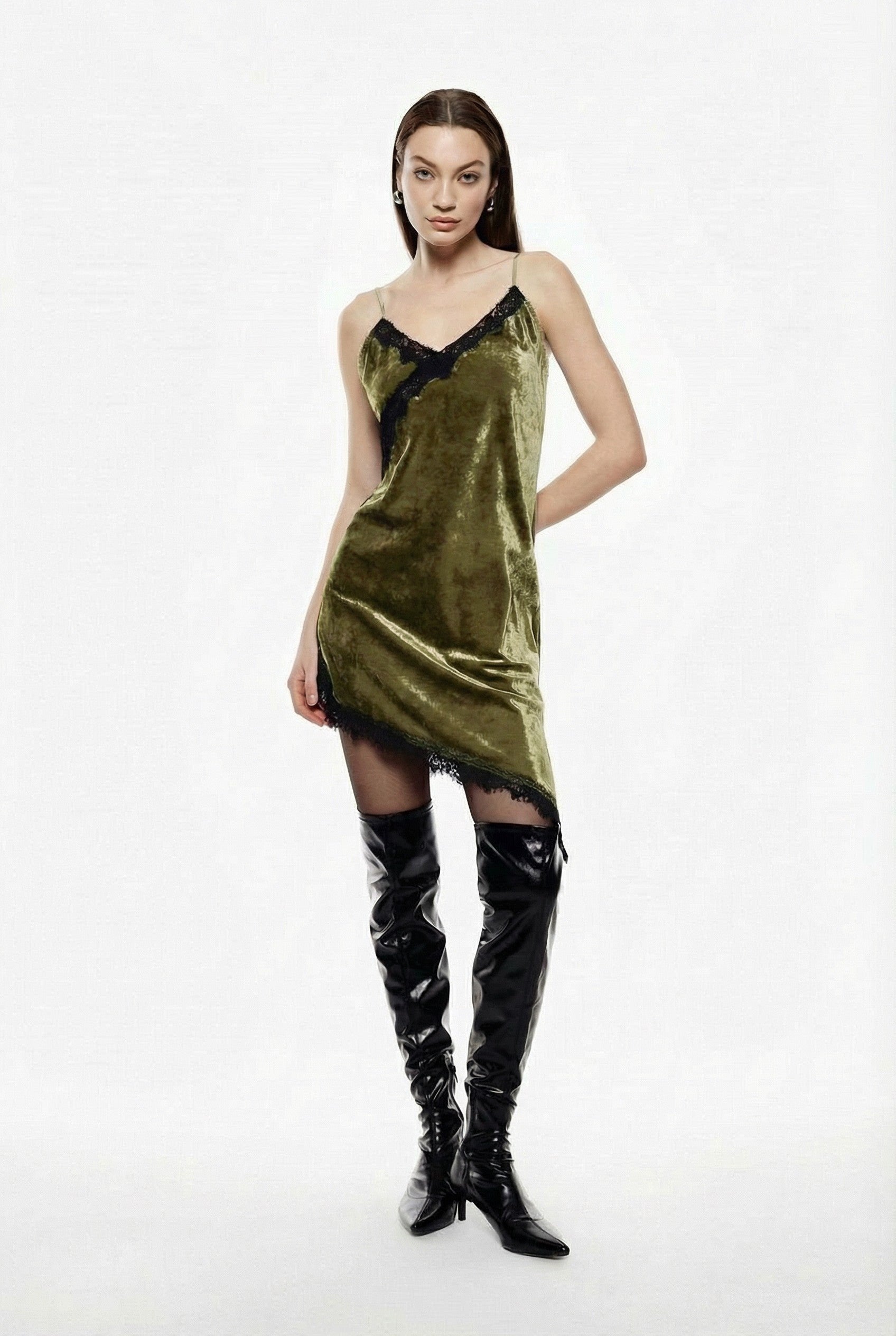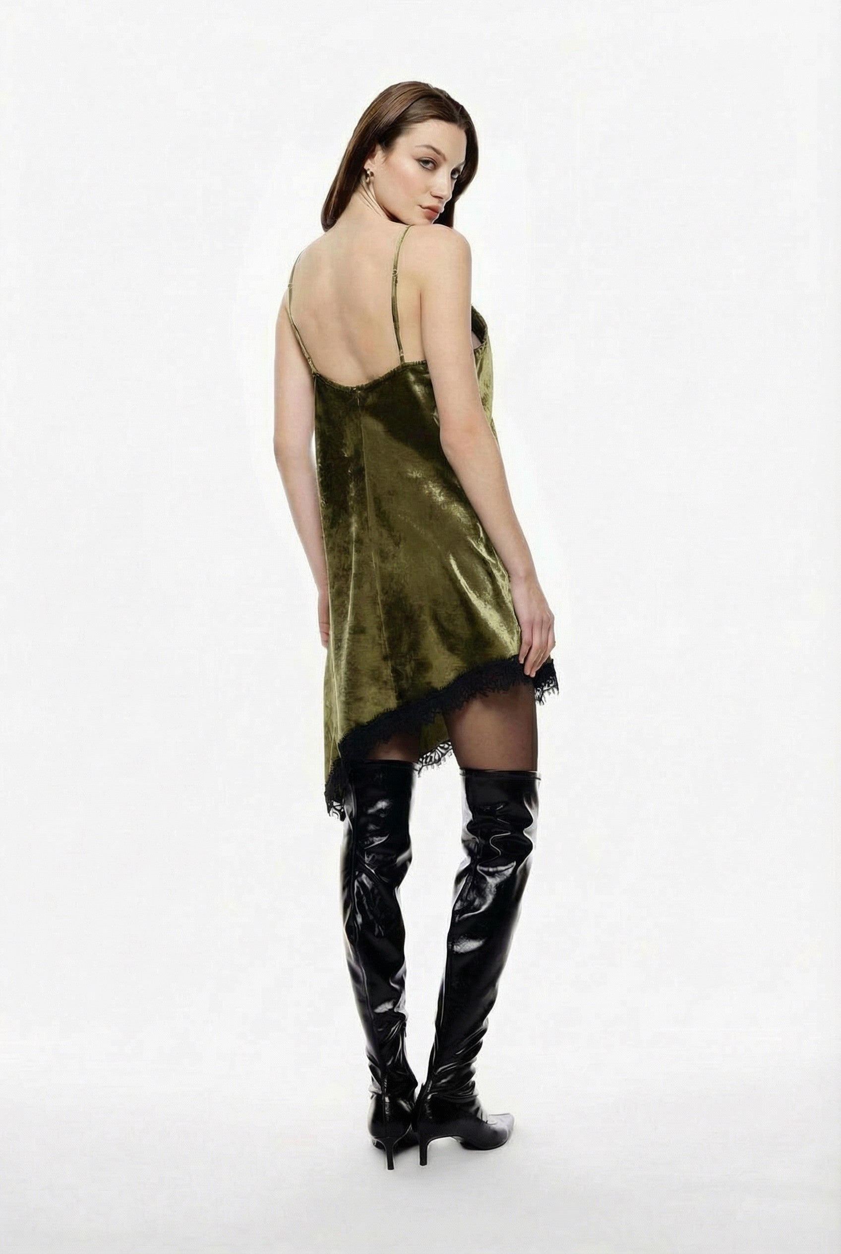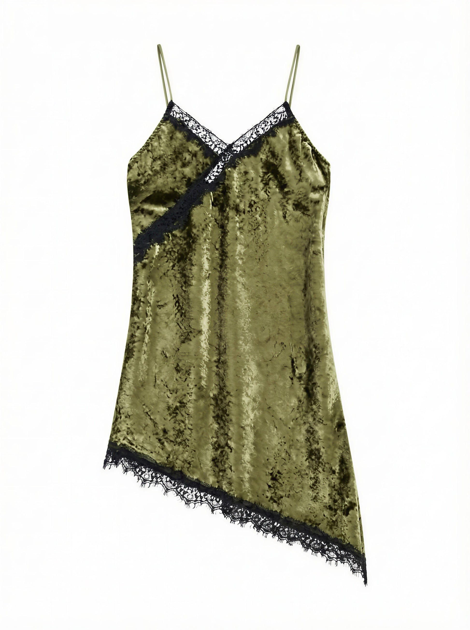 Design minimalista e silhouette fluida caratterizzano questo abito corto con spalline sottili. L’inserto in pizzo sullo scollo a v e sul fondo dona raffinatezza, mentre la linea asimmetrica ispira possibilità di stile distintive