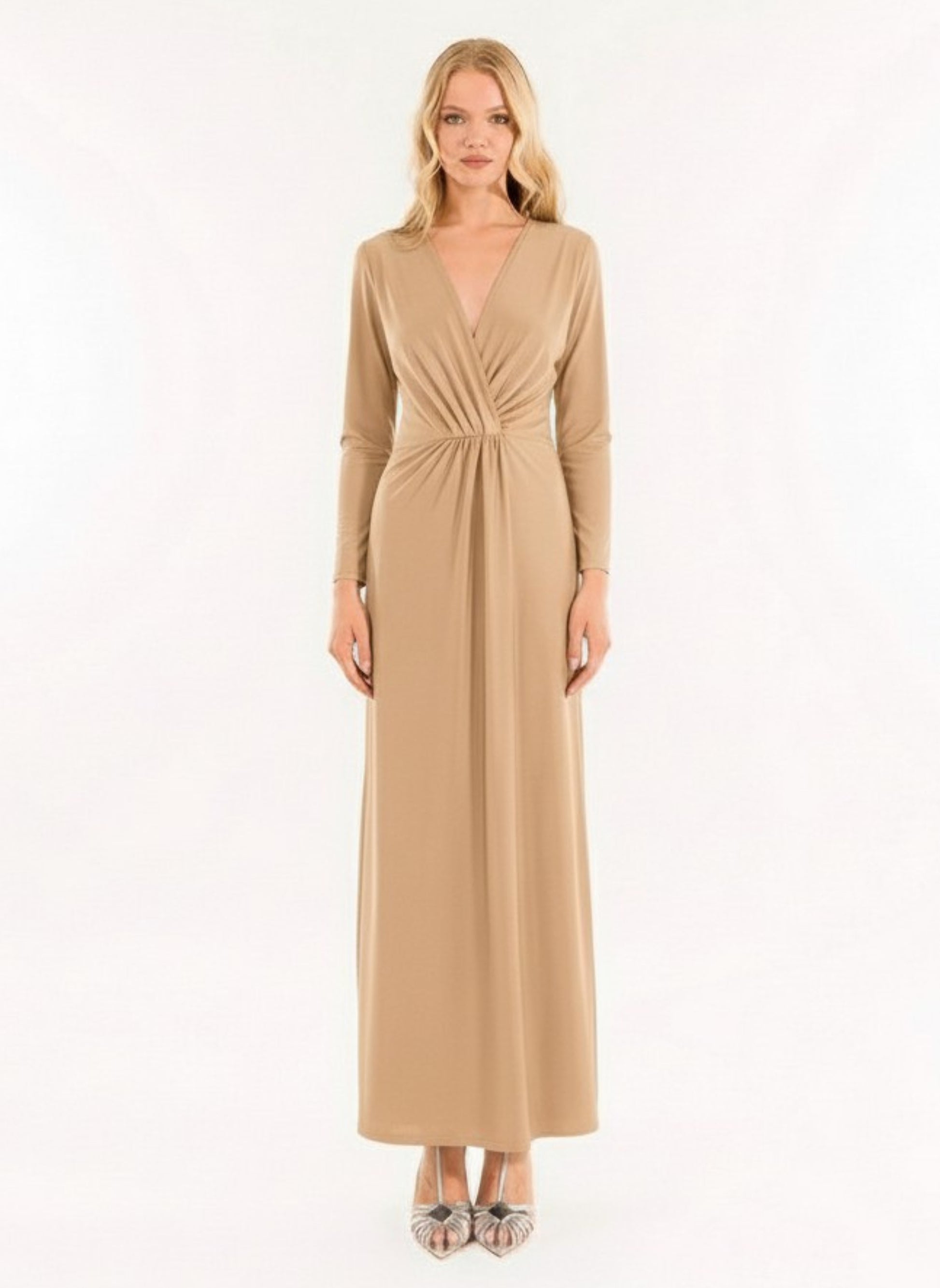 Abito lungo, scollo a V con maxi spacco e drappeggio.