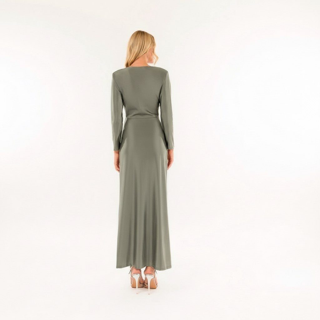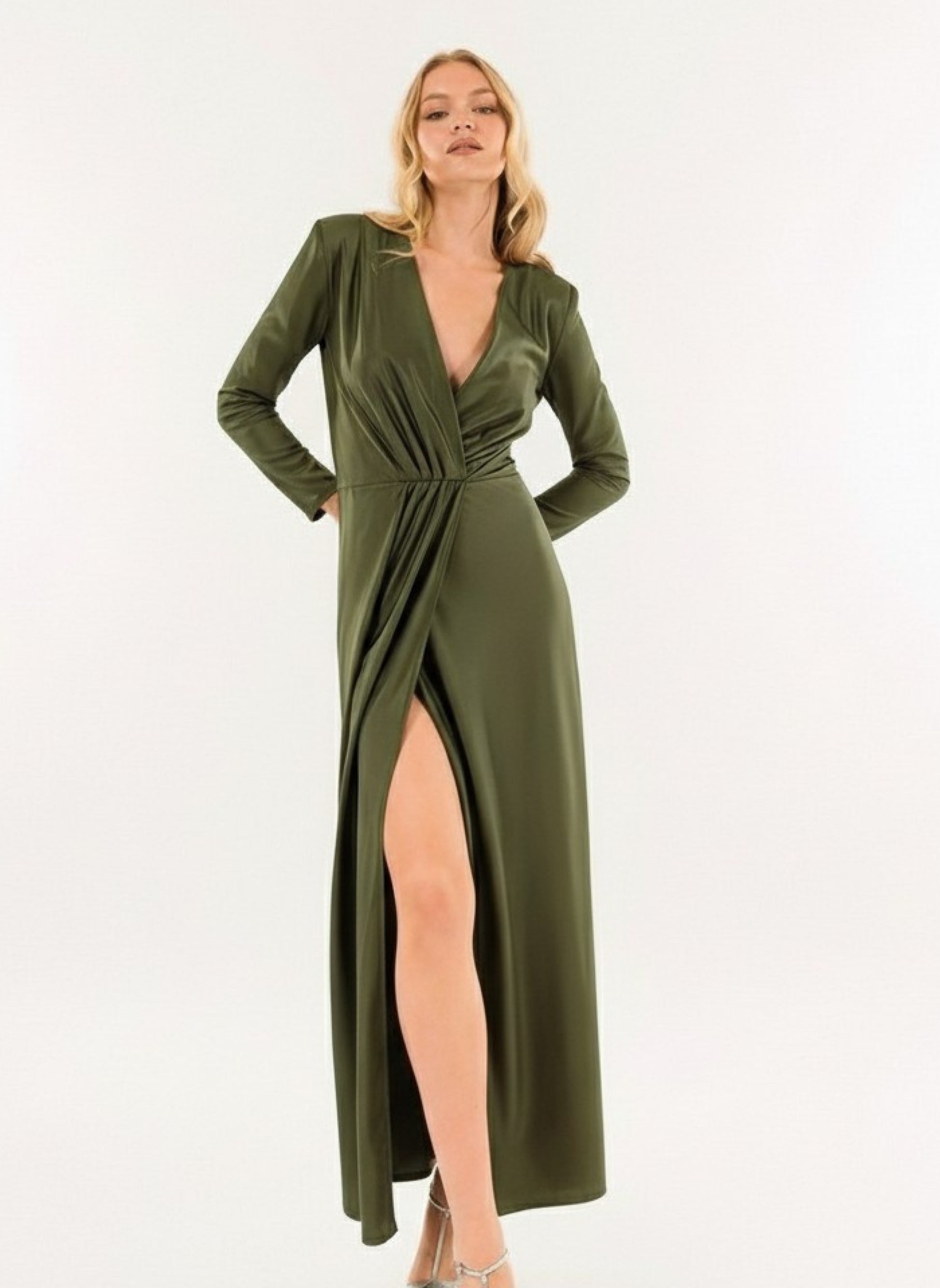 Abito lungo, scollo a V con maxi spacco e drappeggio.