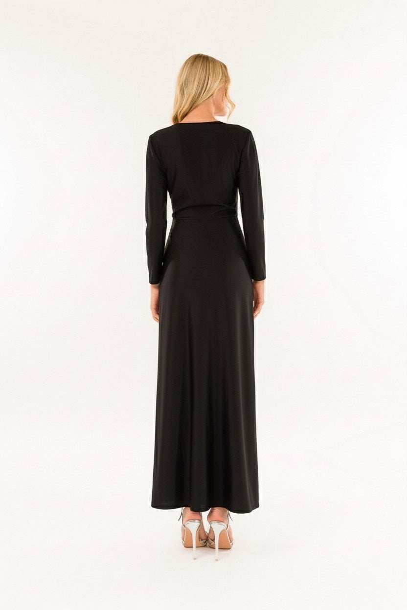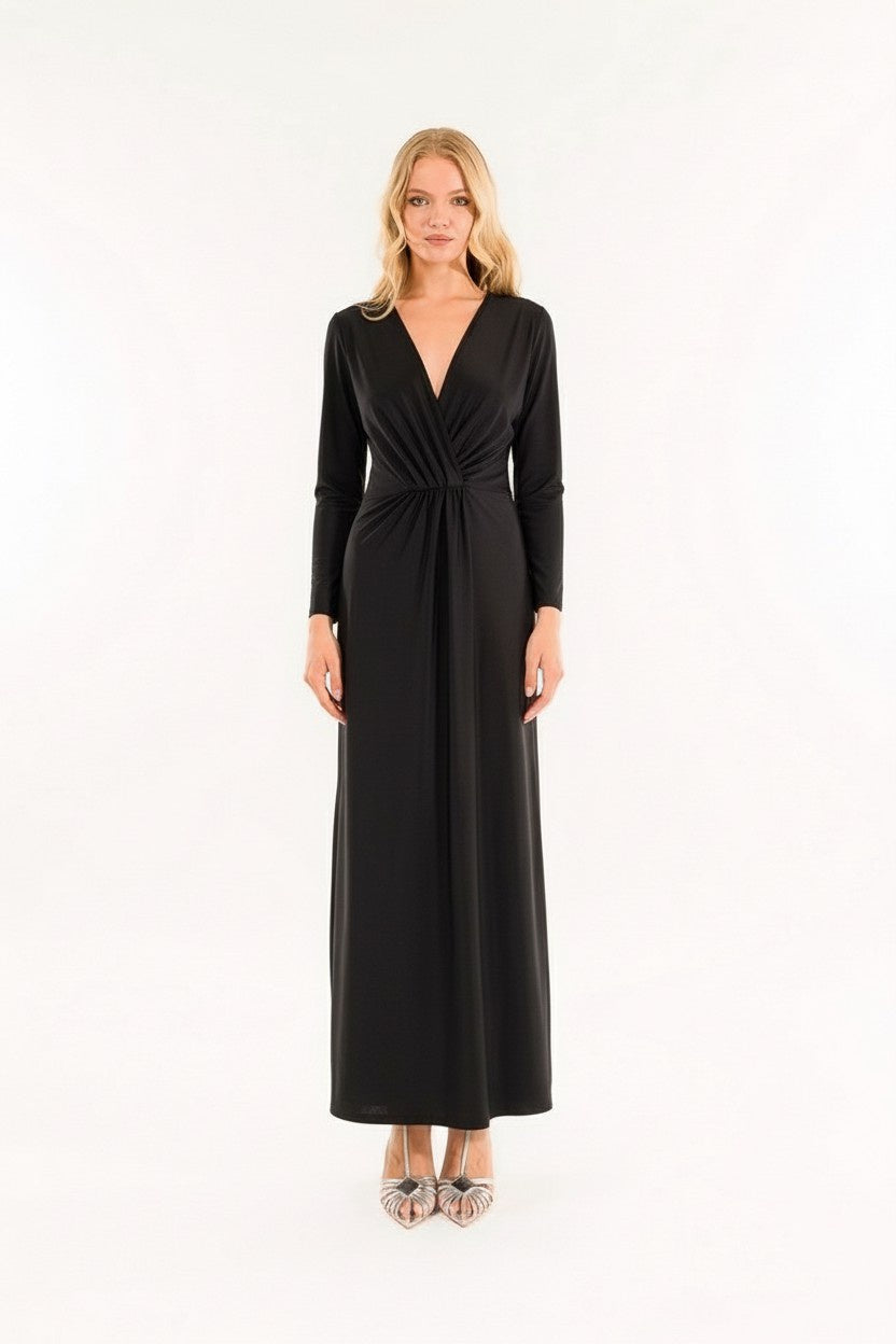 Abito lungo, scollo a V con maxi spacco e drappeggio.