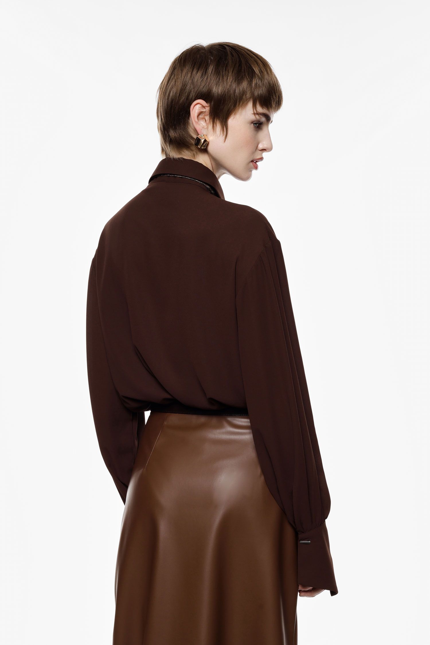 Body camicia dalla linea regolare con maniche lunghe ampie e polsini estesi, valorizzato da un colletto classico e abbottonatura nascosta sul davanti. Una soluzione versatile per chi desidera un look sofisticato e contemporaneo, capace di combinare funzionalità sartoriale e stile individuale anche nei contesti più esigenti.