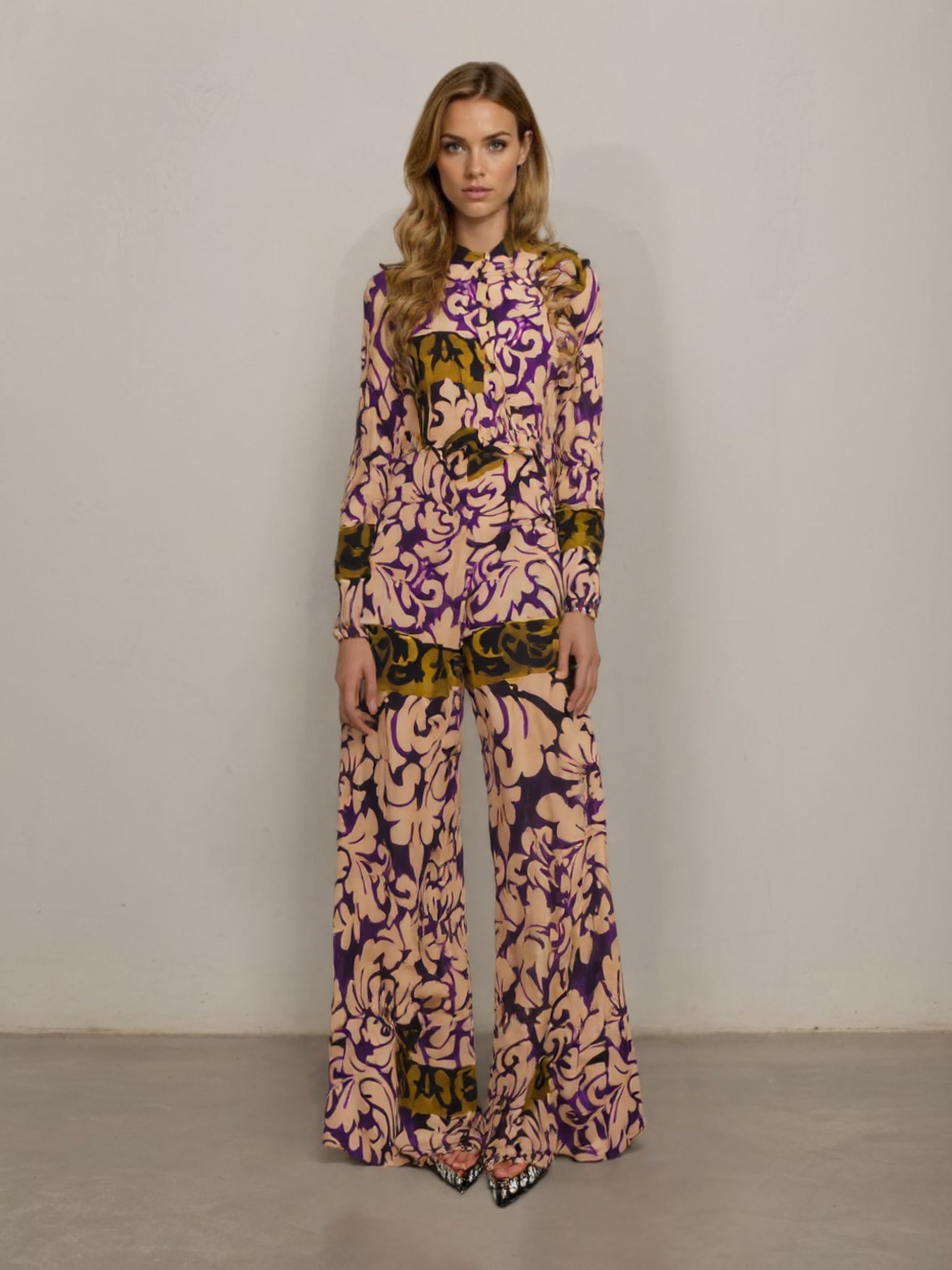 Camicia in tessuto fluido con stampa fantasia nei toni moro-olio, caratterizzata dall'elegante scollo coreano e silhouette morbida. Le maniche lunghe con bracciali integrati conferiscono un tocco di raffinatezza contemporanea. La texture leggera garantisce comfort e vestibilità impeccabile per ogni occasione.