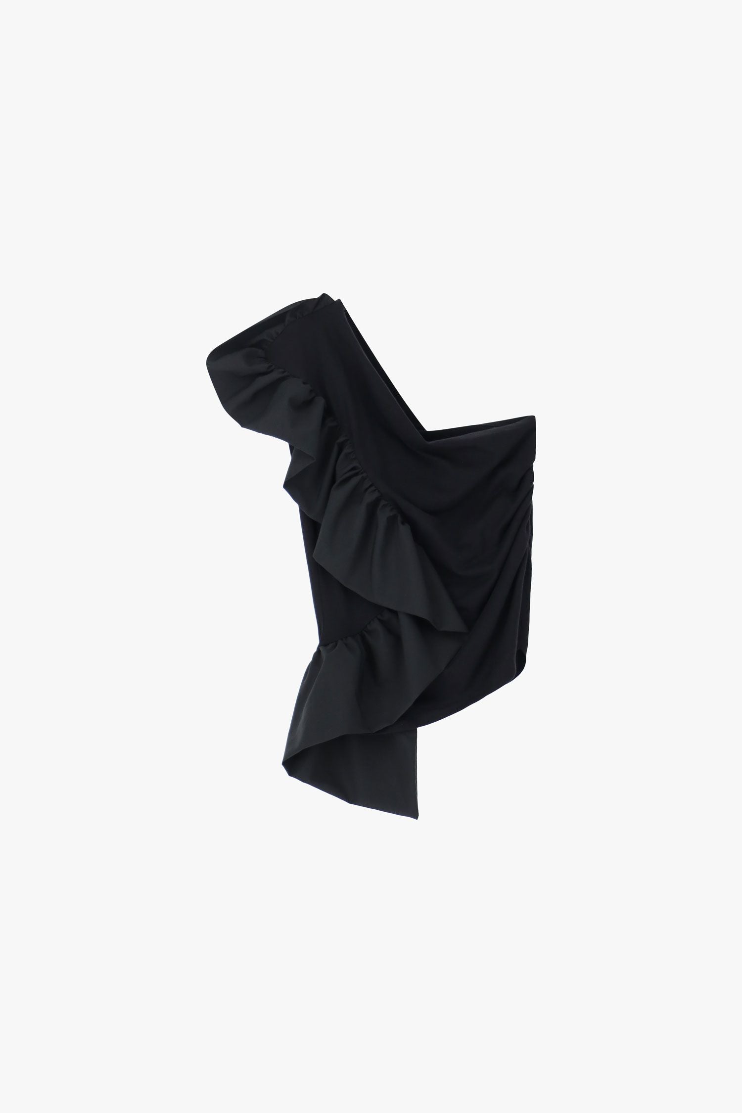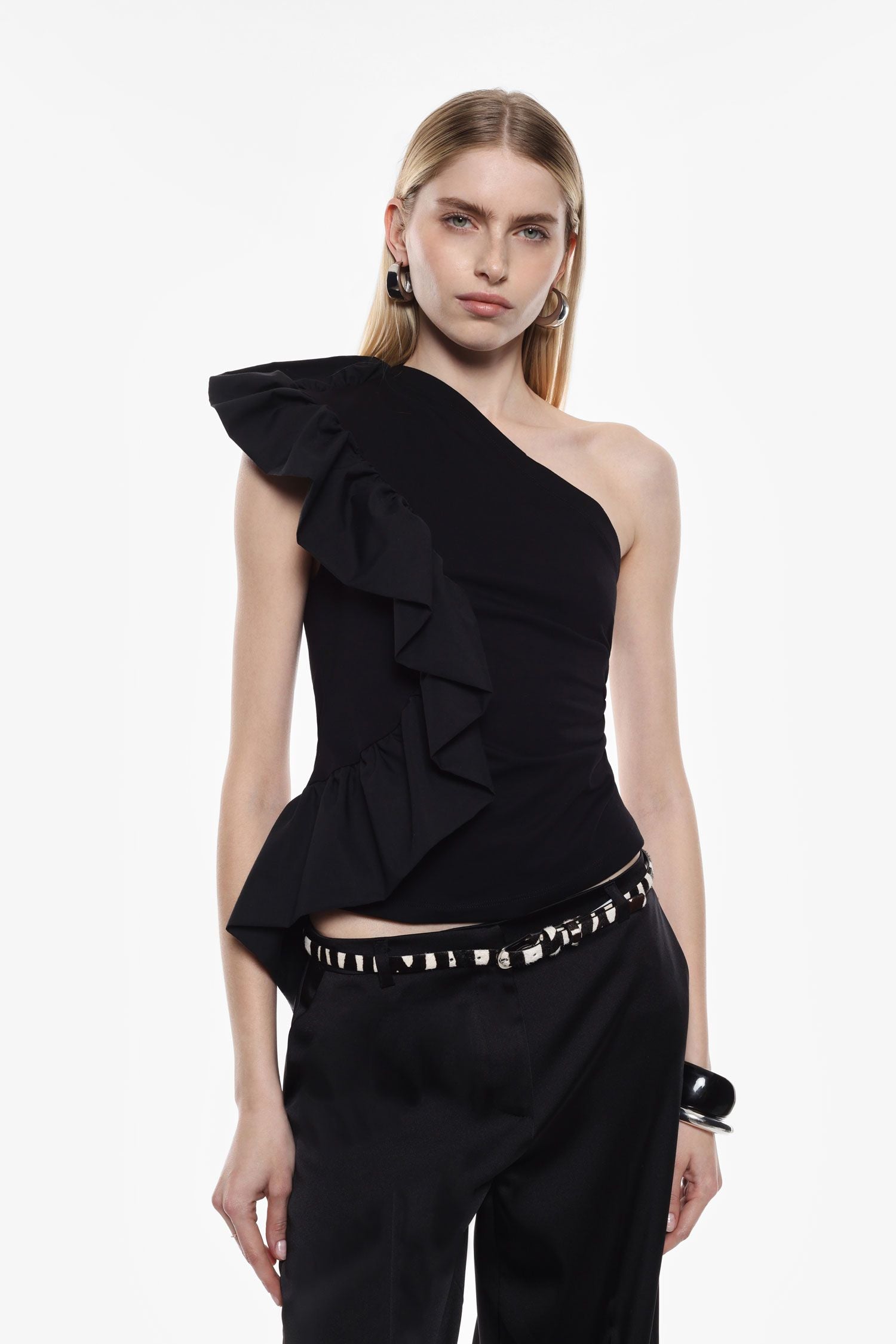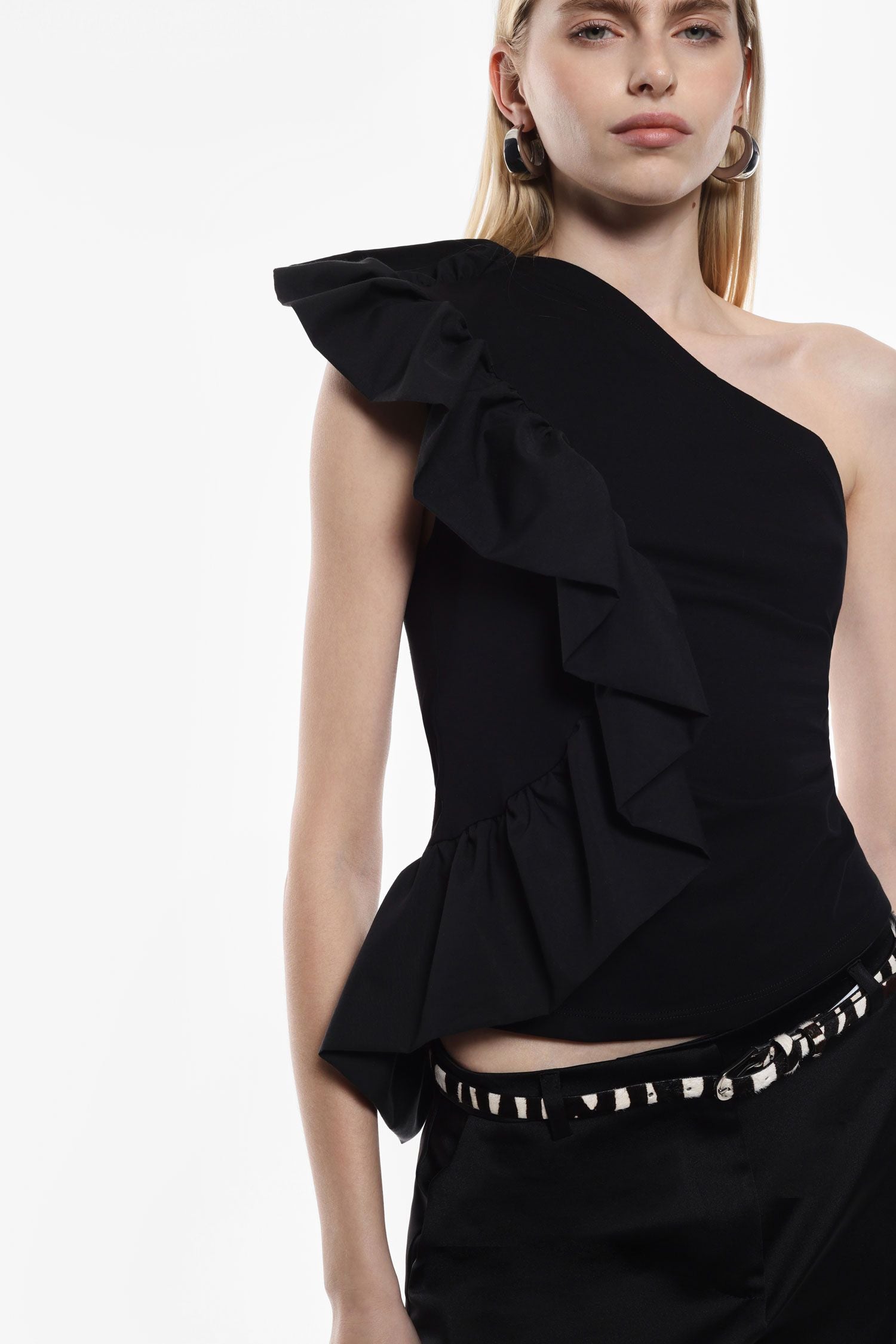 Un top asimmetrico che cattura l'attenzione con il suo design strutturato e dettagli con volant. Perfetto per chi cerca di aggiungere un tocco distintivo al proprio guardaroba, questo capo offre versatilità per ogni occasione. L'elegante linea pulita e i dettagli raffinati rendono questo top un must per la donna moderna che desidera esprimere il proprio stile unico.