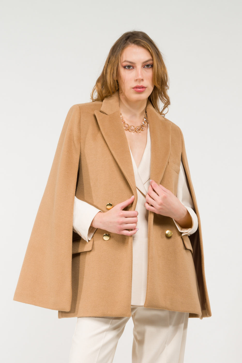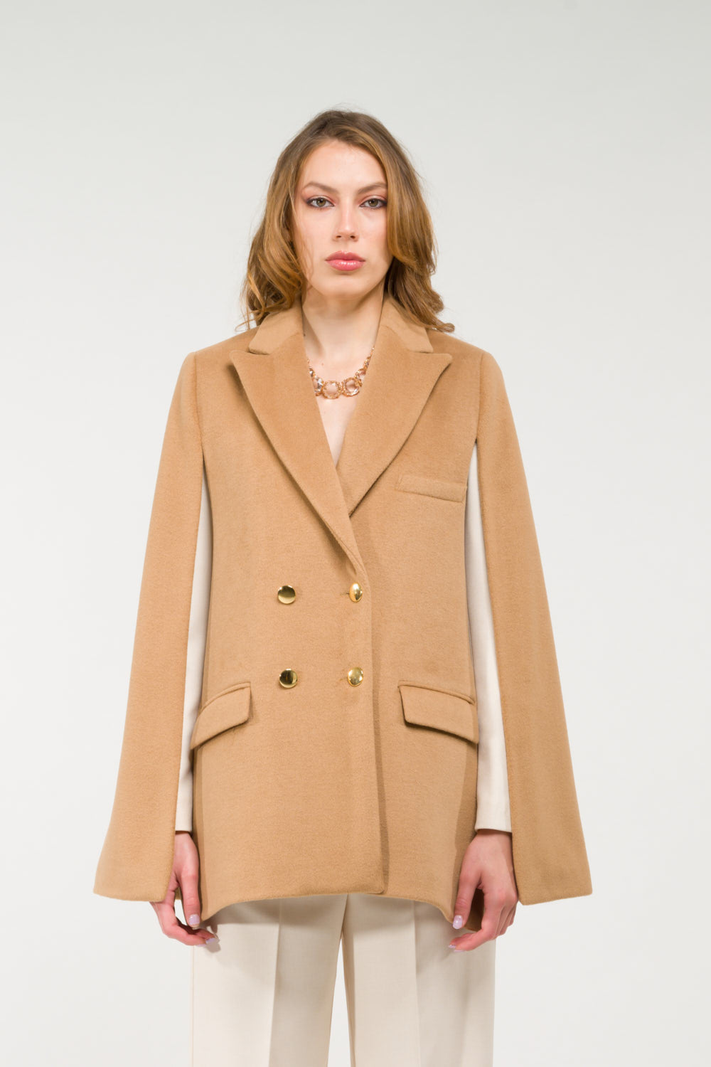 Cappa doppiopetto bottoni dorati e tasche sul davanti.