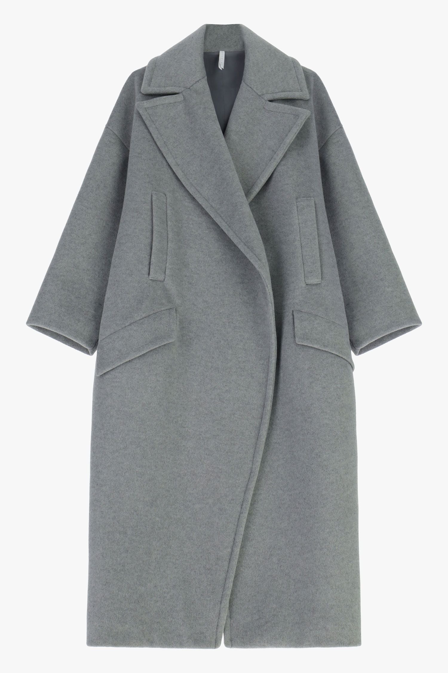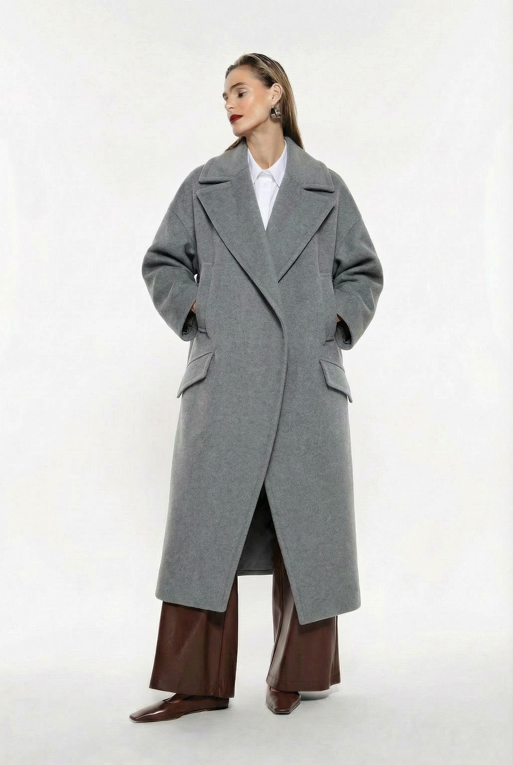 Cappotto dalla linea oversize con spalle scese e maxi revers, offre una silhouette distintiva e avvolgente. Tasche frontali con patta e taglio lungo conferiscono stile contemporaneo e versatilità.