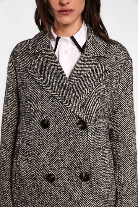 Il cappotto doppiopetto è caratterizzato da tasche verticali e fantasia spigata.