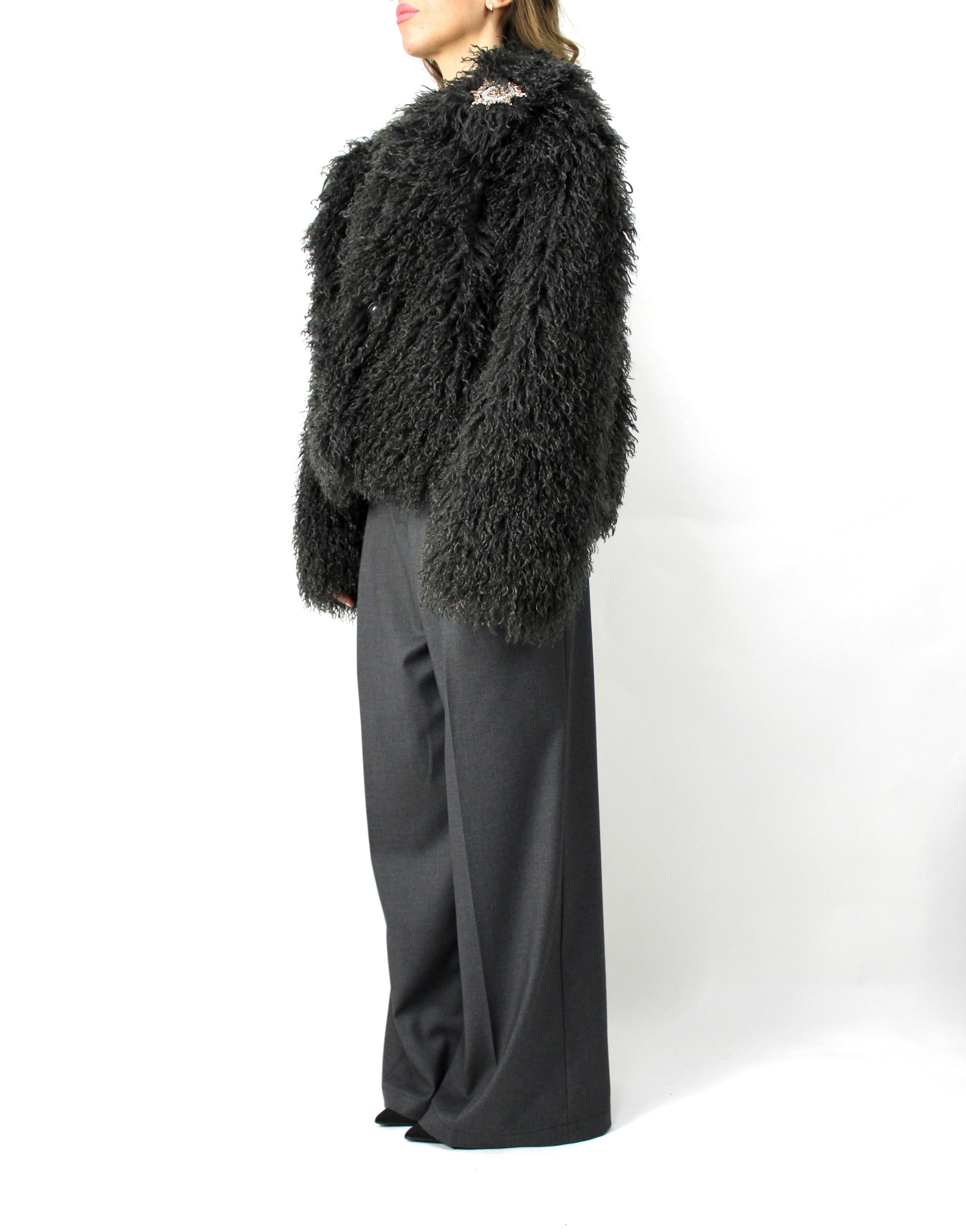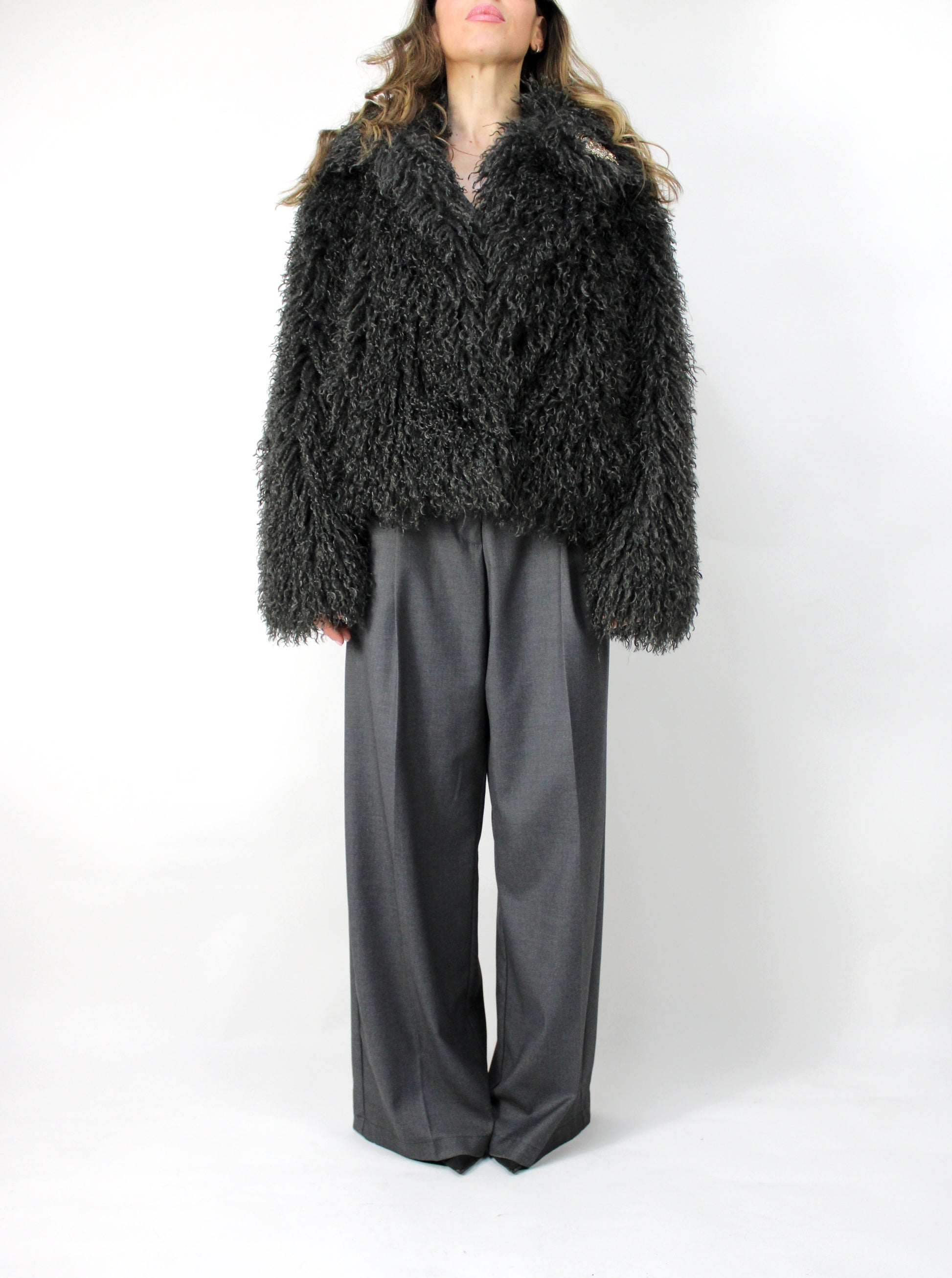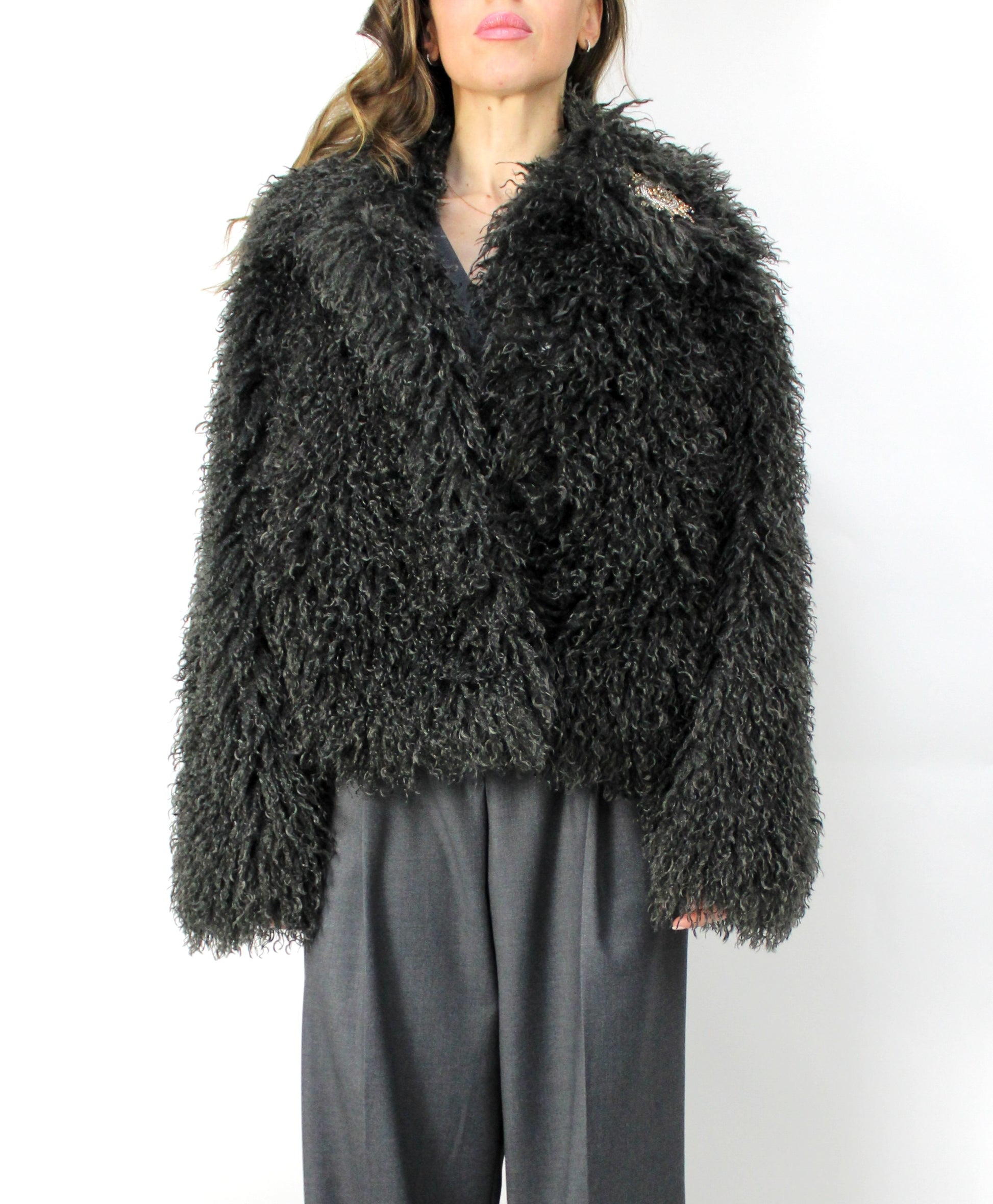 Giacca eco mongolia ,spilla removibile,con fodera e chiusura con bottoni automatici.