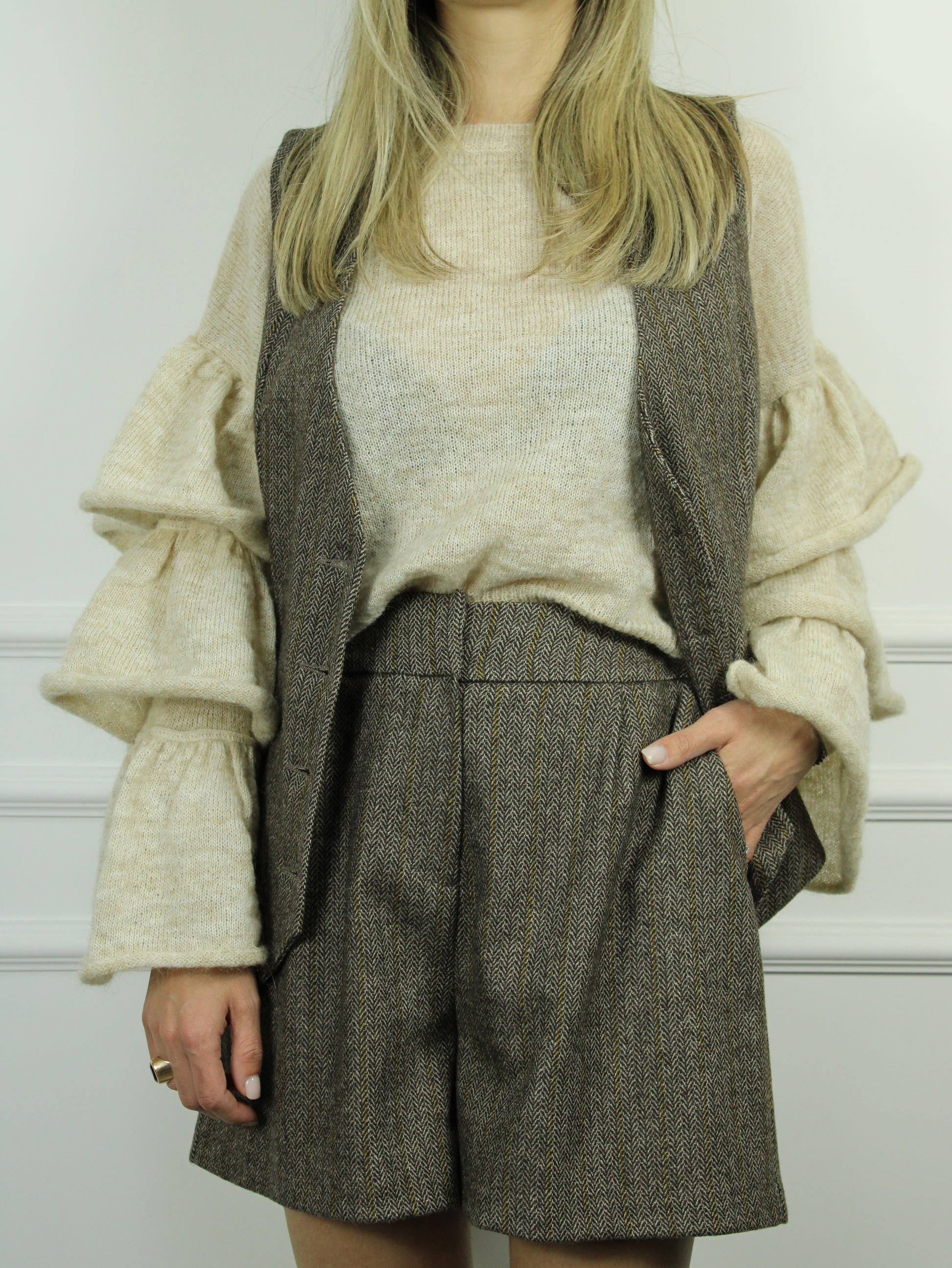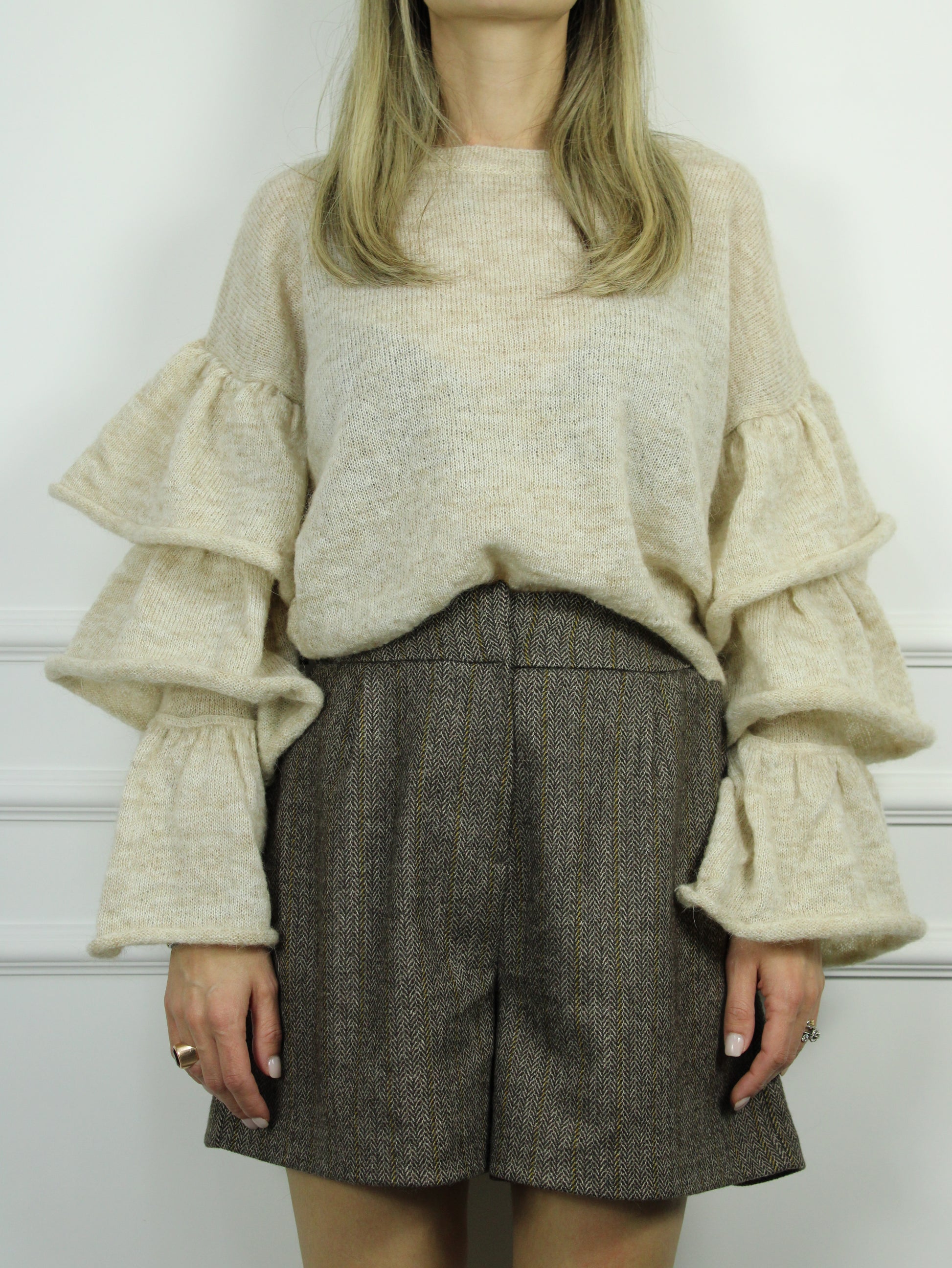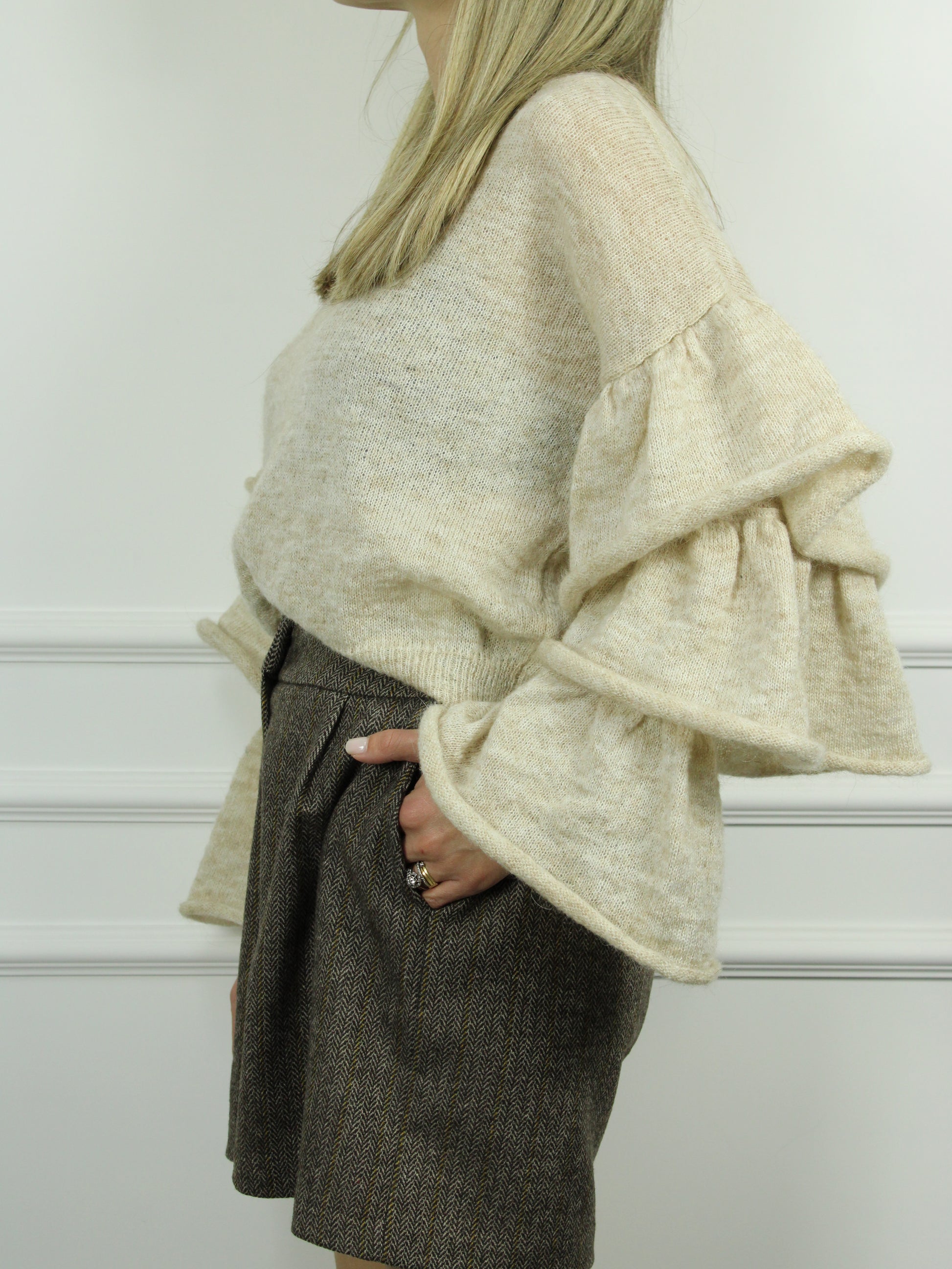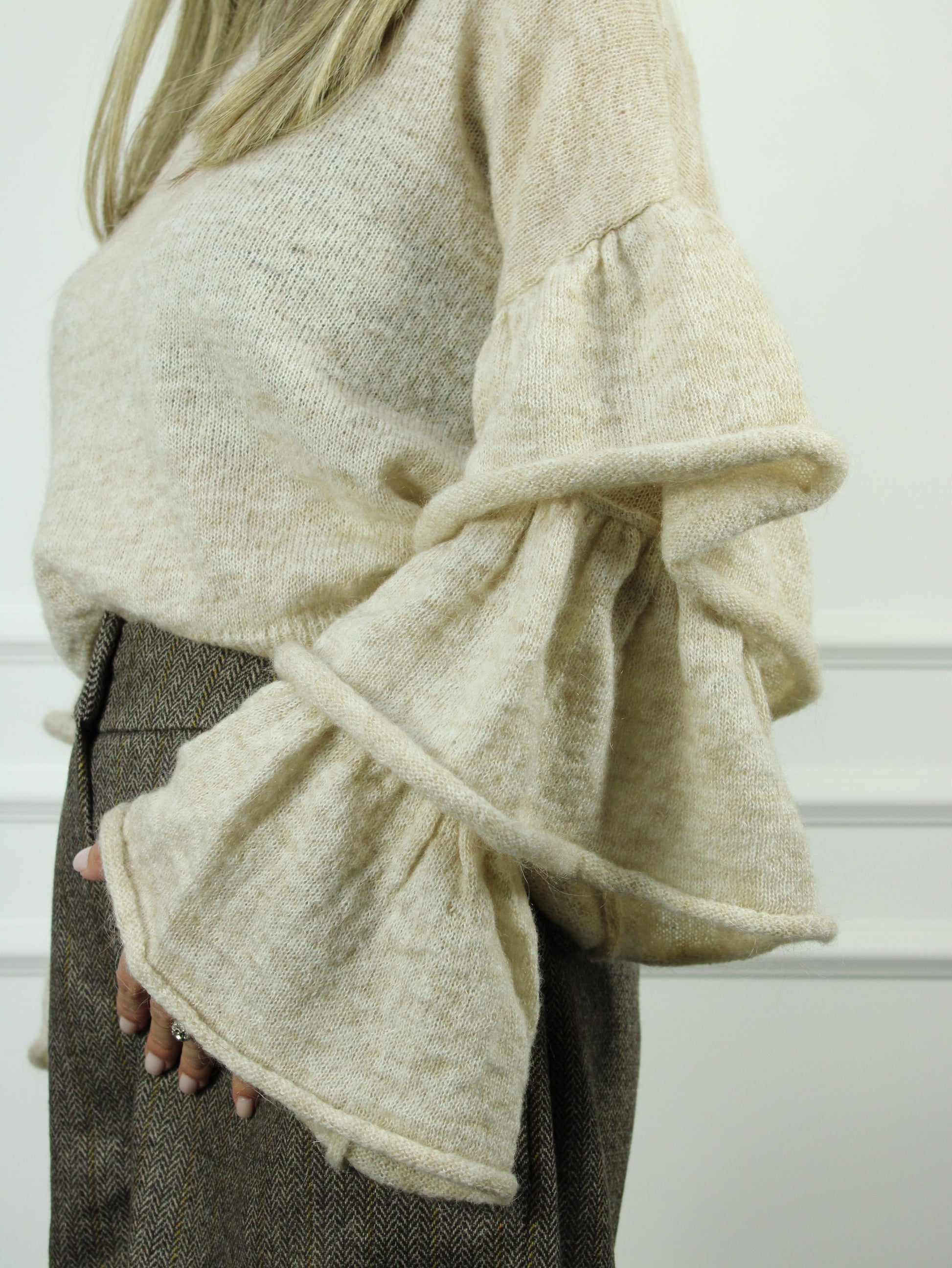 Maglia girocollo a tinta unita con balze sulle maniche.