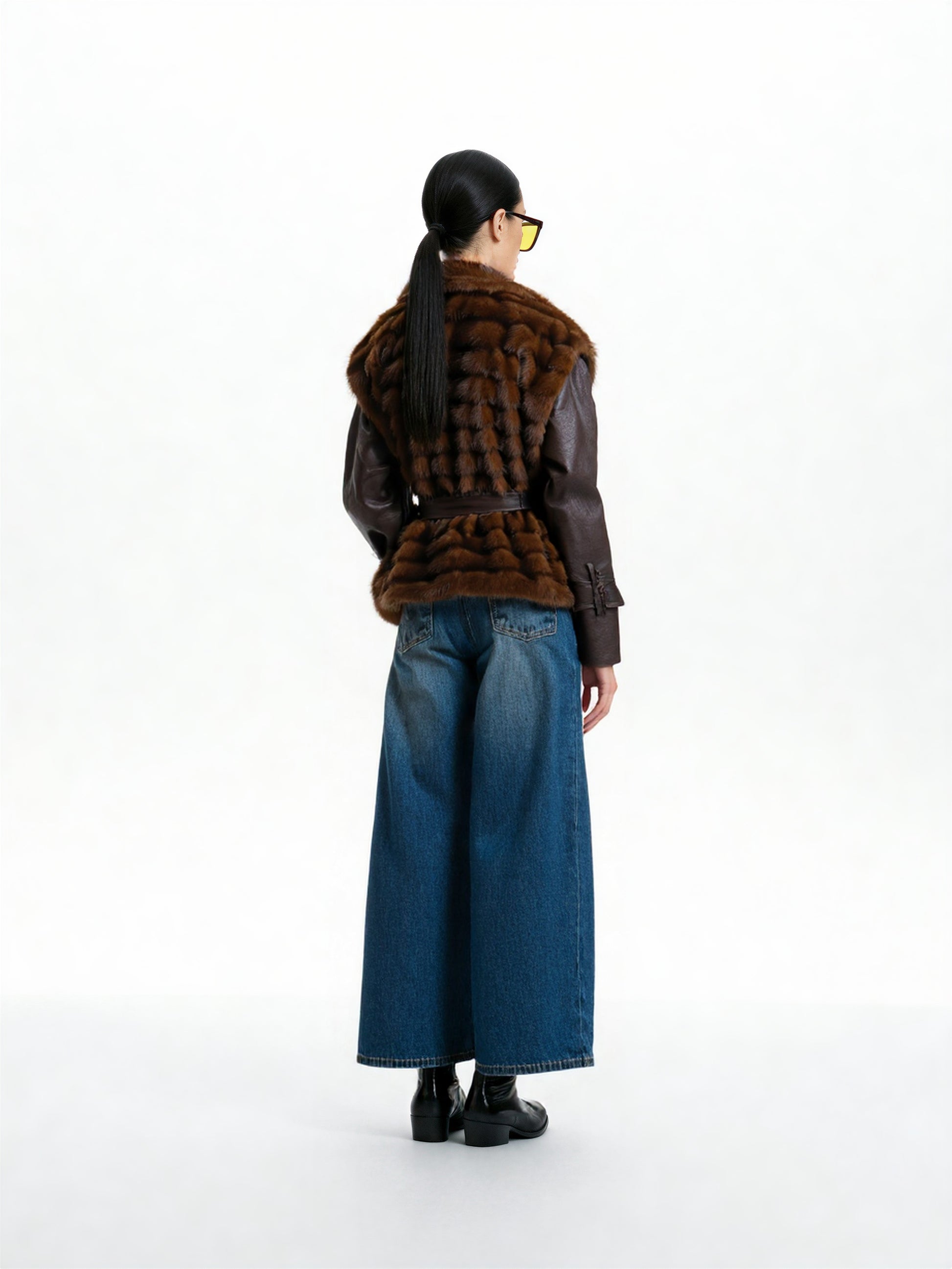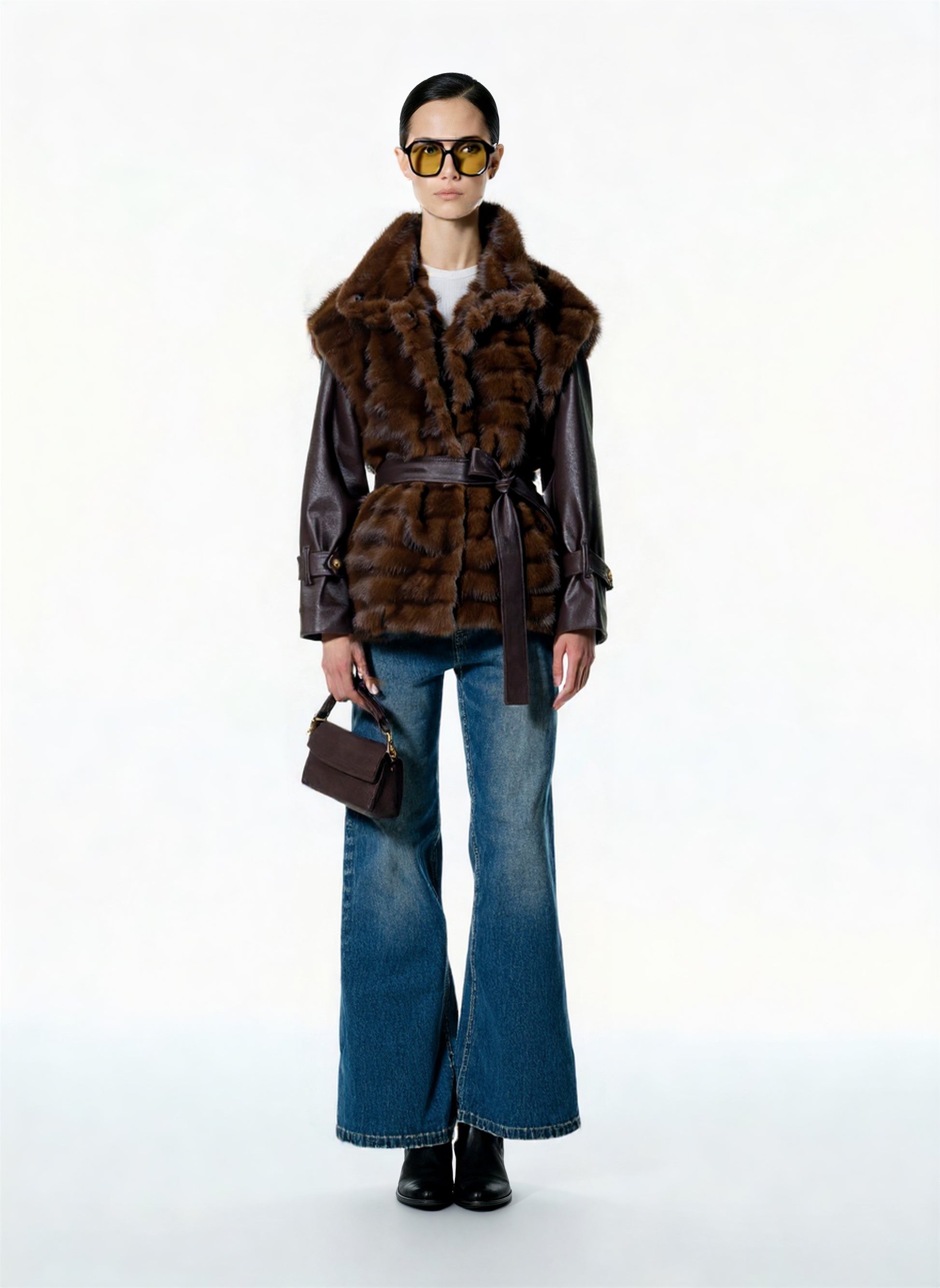 Questa giacca combina la calda morbidezza della pelliccia ecologica, alle maniche e cintura in ecopelle, conferendo un’estetica contemporanea e raffinata. Le tasche laterali offrono funzionalità senza compromettere lo stile, mentre la chiusura con bottoni a clip nascosti mantiene un profilo pulito e sofisticato. Pensata per garantire comfort e personalità.