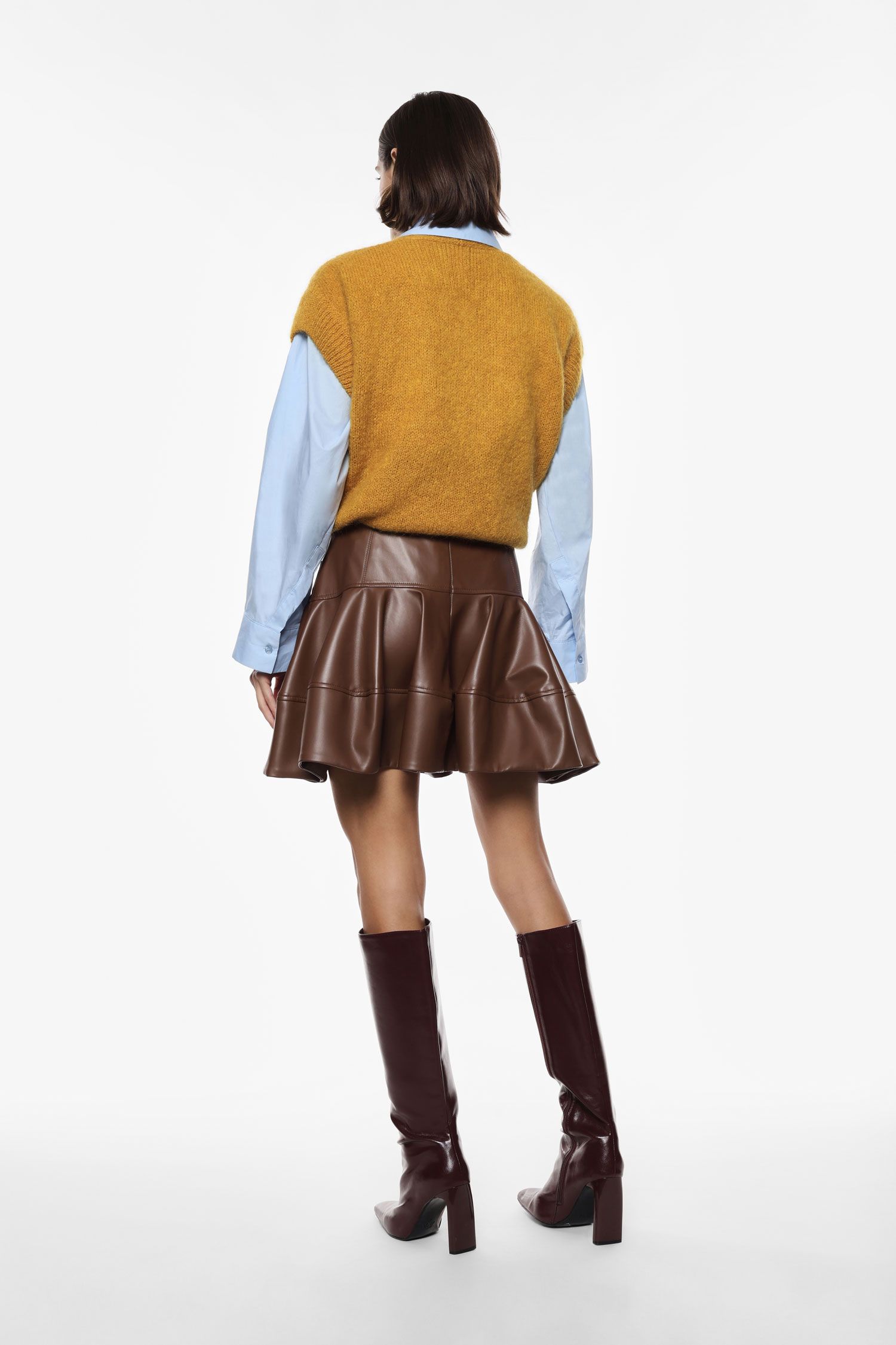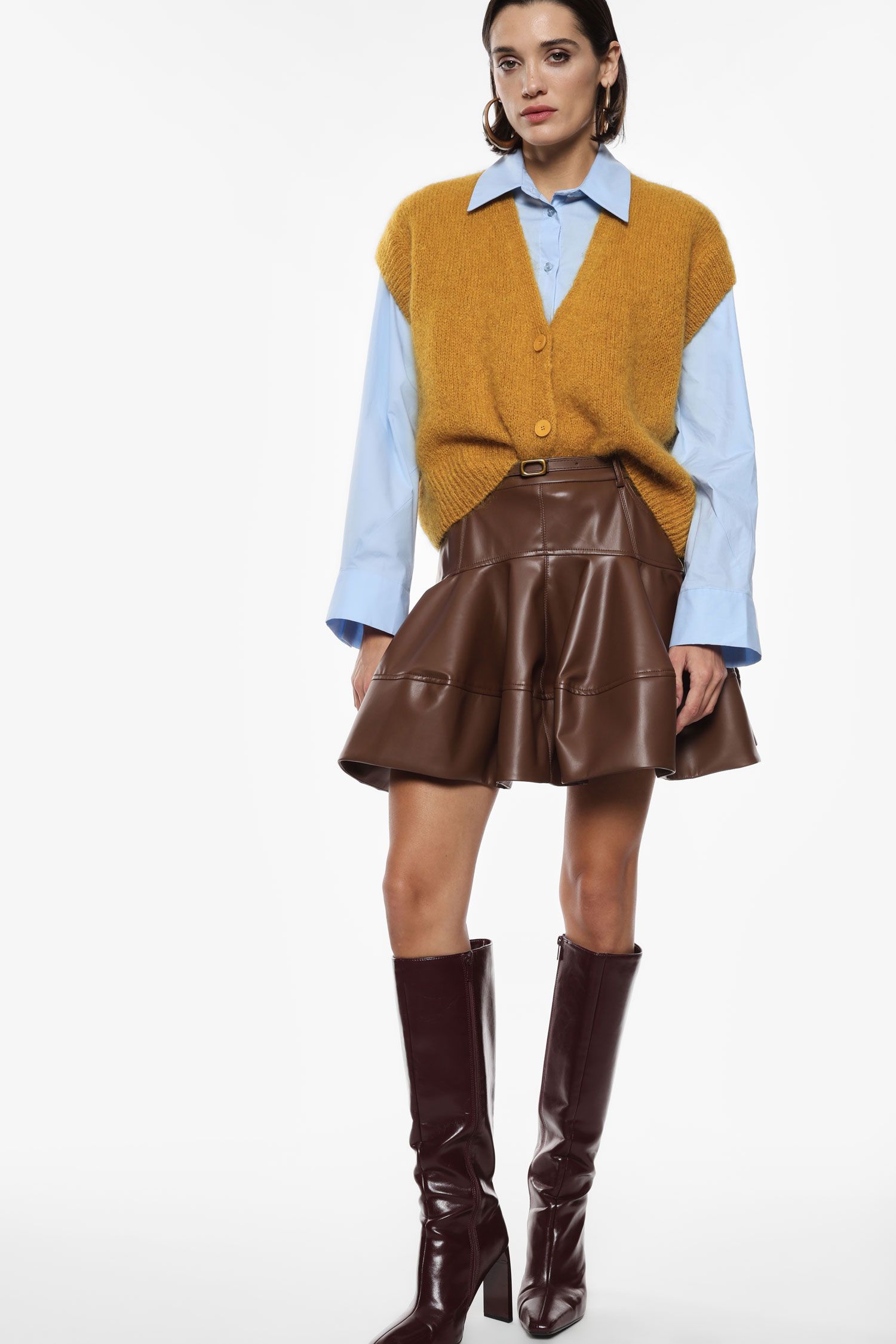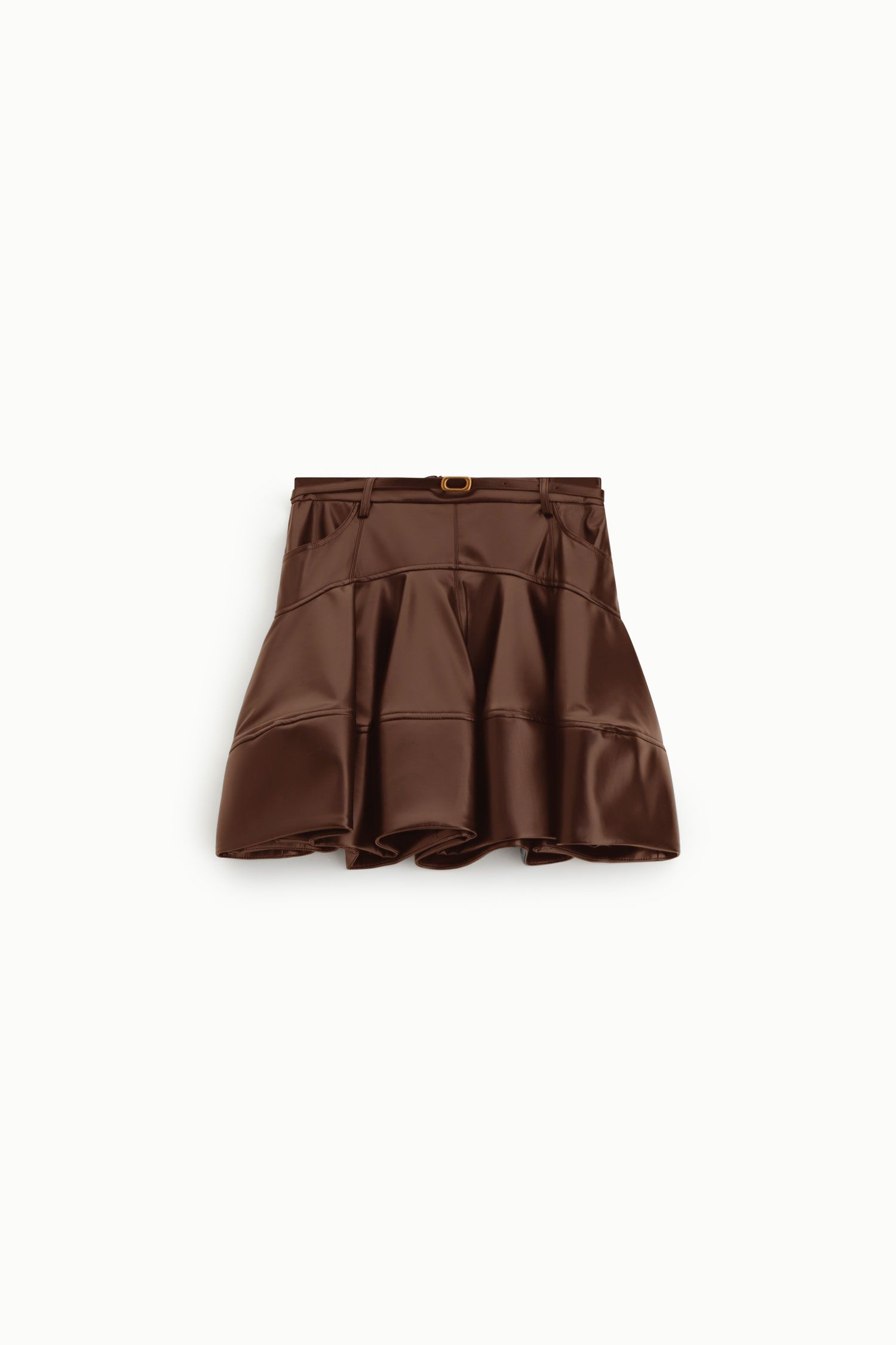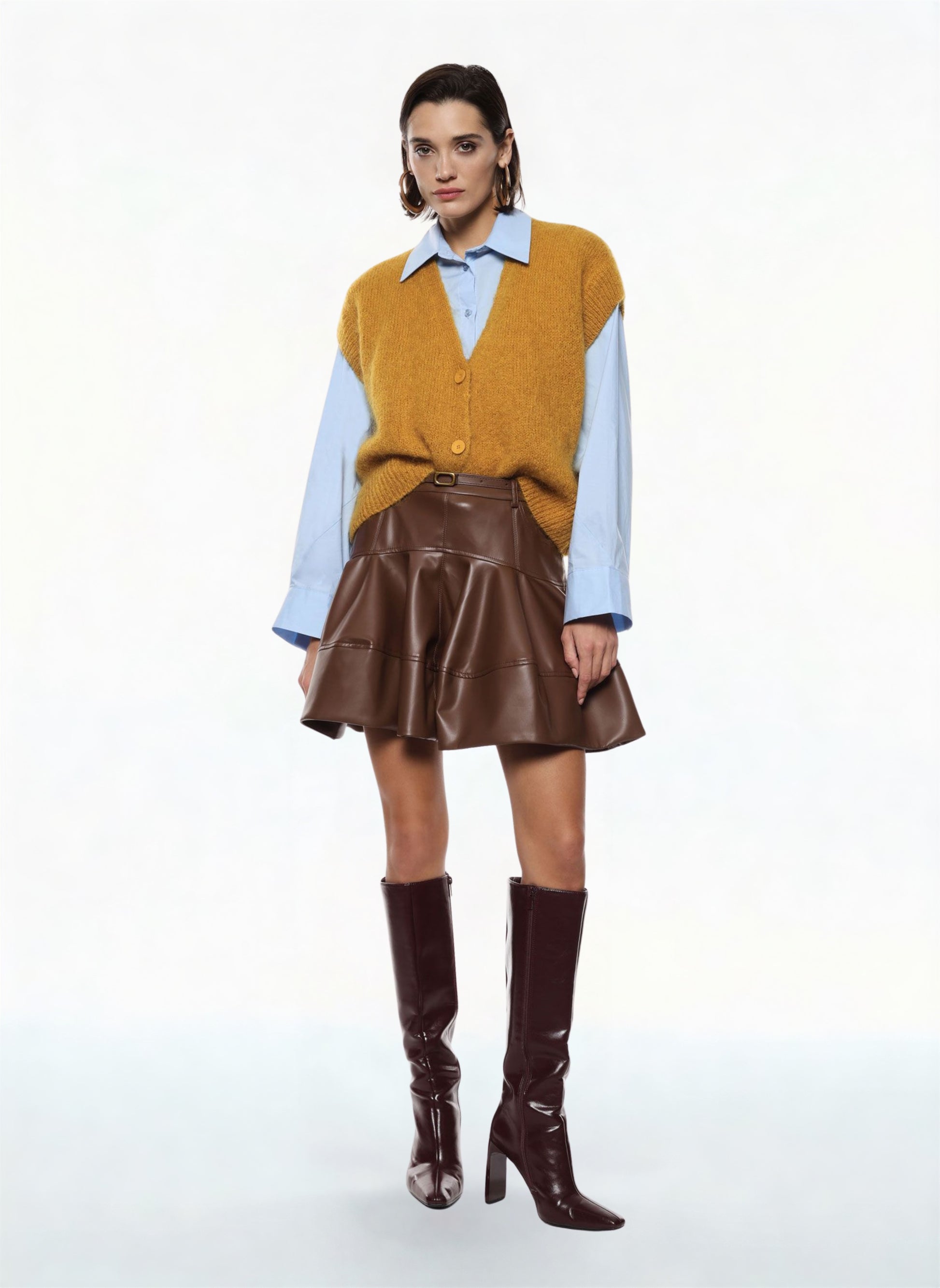 Gonna corta a vita alta con linea svasata, caratterizzata da cuciture a vista che aggiungono profondità al design. La cintura con fibbia conferisce definizione alla silhouette, completando un capo versatile ideale per abbinamenti metropolitani e sofisticati, perfetto per chi ricerca uno stile distintivo e contemporaneo.
