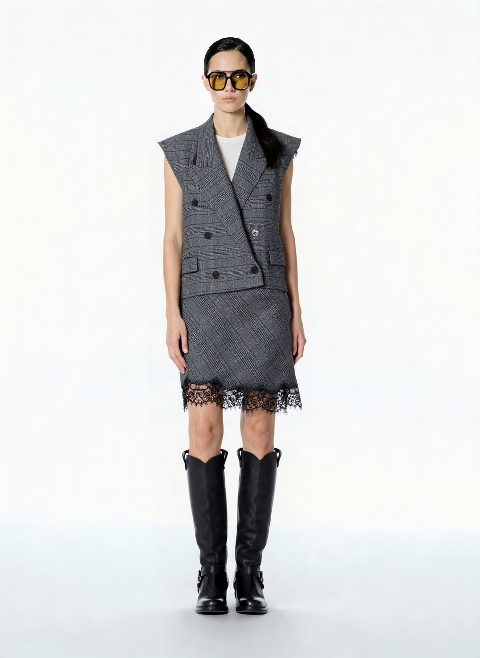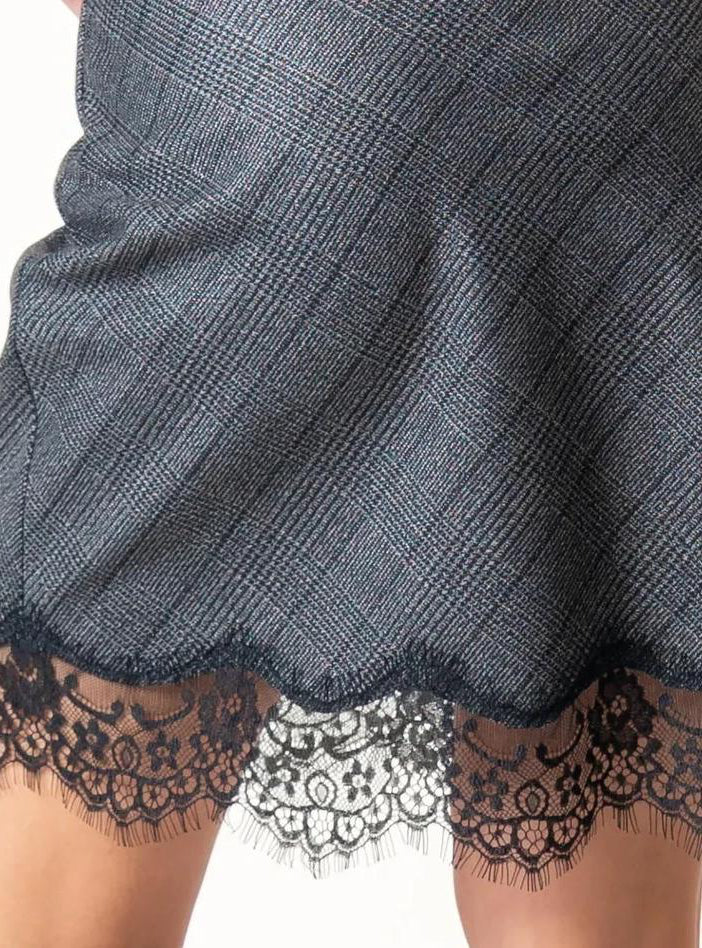 Minigonna in tessuto principe di galles con pizzo ed elastico in vita.