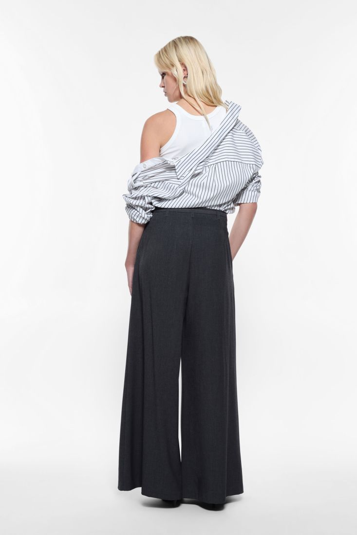 Un'estetica raffinata e moderna si sposa con il comfort in questi pantaloni a palazzo. Dotati di una cintura coordinata, catturano l'attenzione con il loro taglio ampio e fluente, perfetti per affrontare con stile qualsiasi occasione formale. Lasciati avvolgere dall'eleganza sofisticata che questi pantaloni incarnano, diventando il punto focale del tuo look.