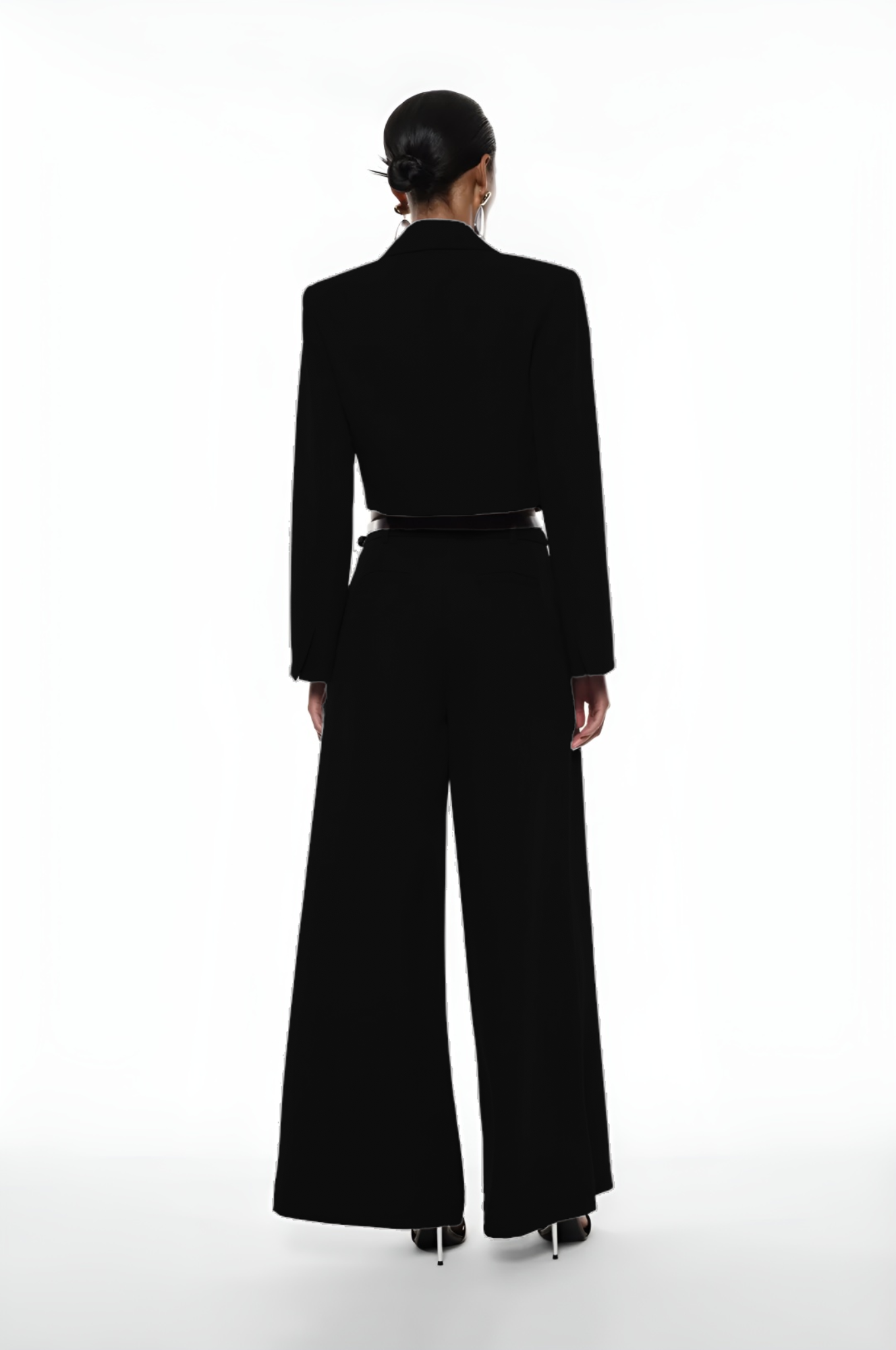 Pantaloni palazzo caratterizzati da una linea ampia e fluida, impreziositi da pinces frontali e cintura coordinata con fibbia metallica. La vita alta valorizza la figura, mentre la lunghezza completa crea un effetto allungante, ideale per comporre outfit sofisticati e dallo stile attuale.