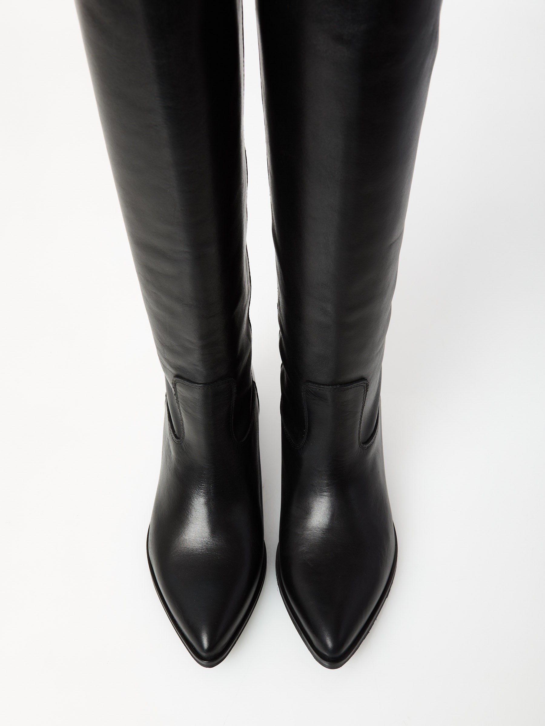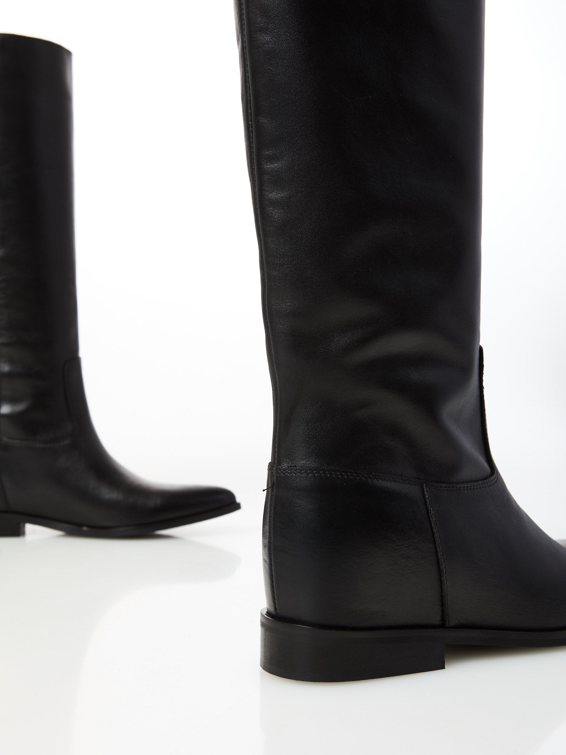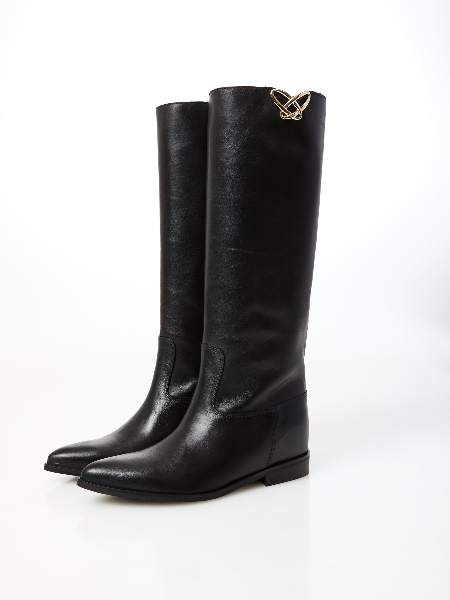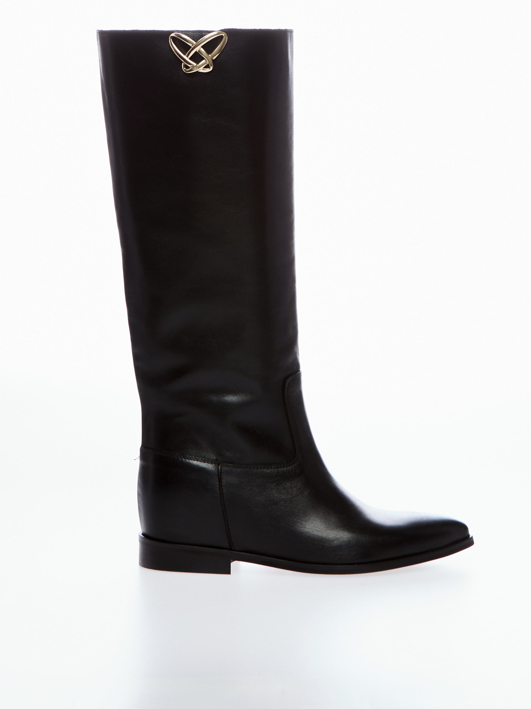 Stivale in pelle, accessorio platino, zeppa interna di 3 cm.