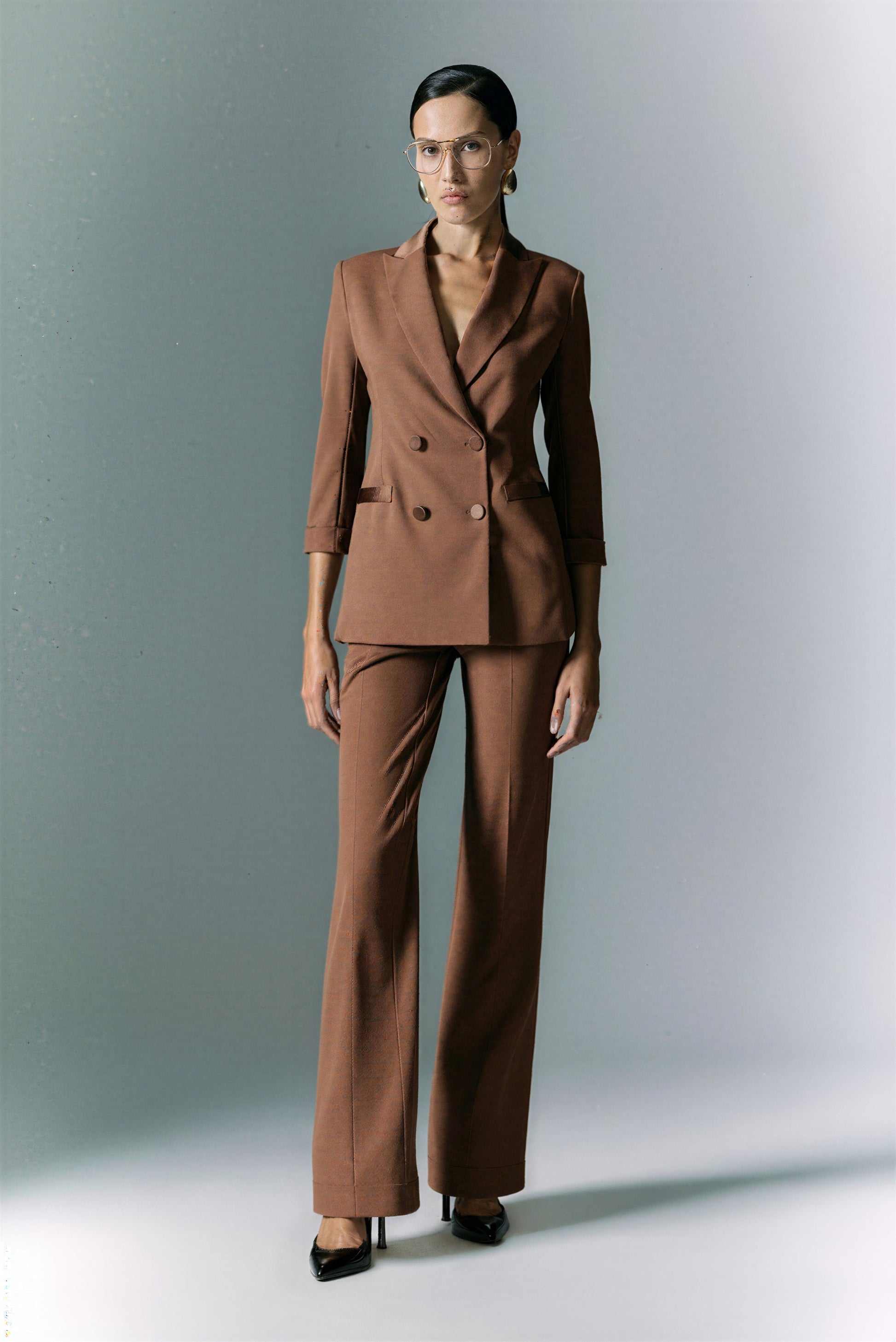 Riscopri l’eleganza con questo tailleur doppiopetto che unisce design sofisticato e dettagli impeccabili. La vestibilità classica valorizza la silhouette, mentre la patta dei bottoni della giacca e il taglio pulito esaltano il tuo look. I pantaloni flare tinta unita sono dotati di vita regolare, tasche verticali e piega stirata.Un capo essenziale per chi ama uno stile ricercato e senza tempo.