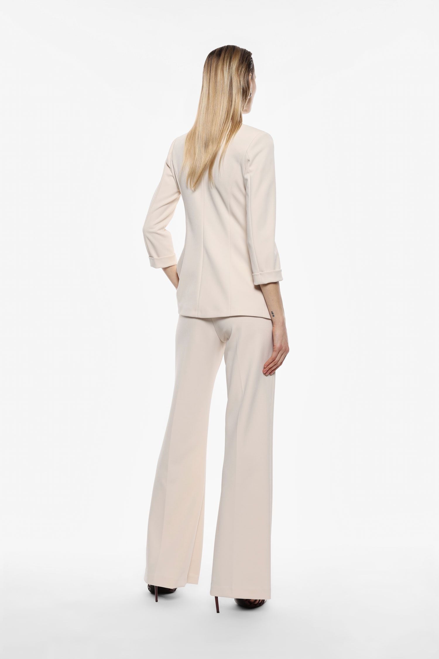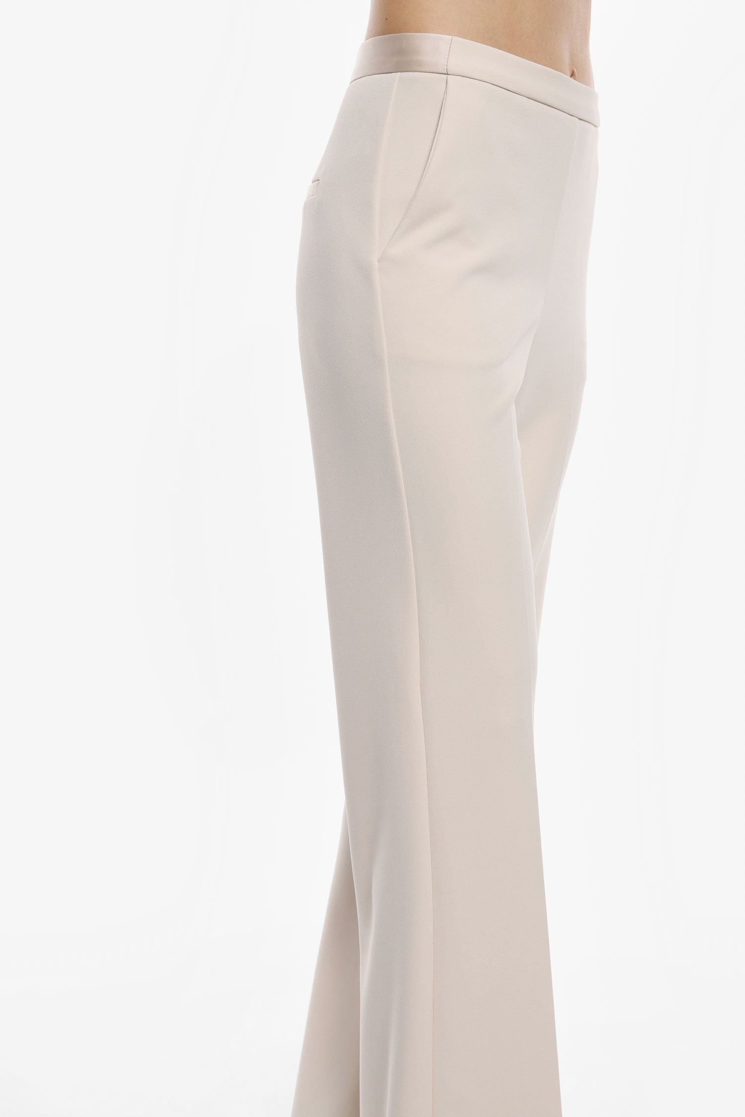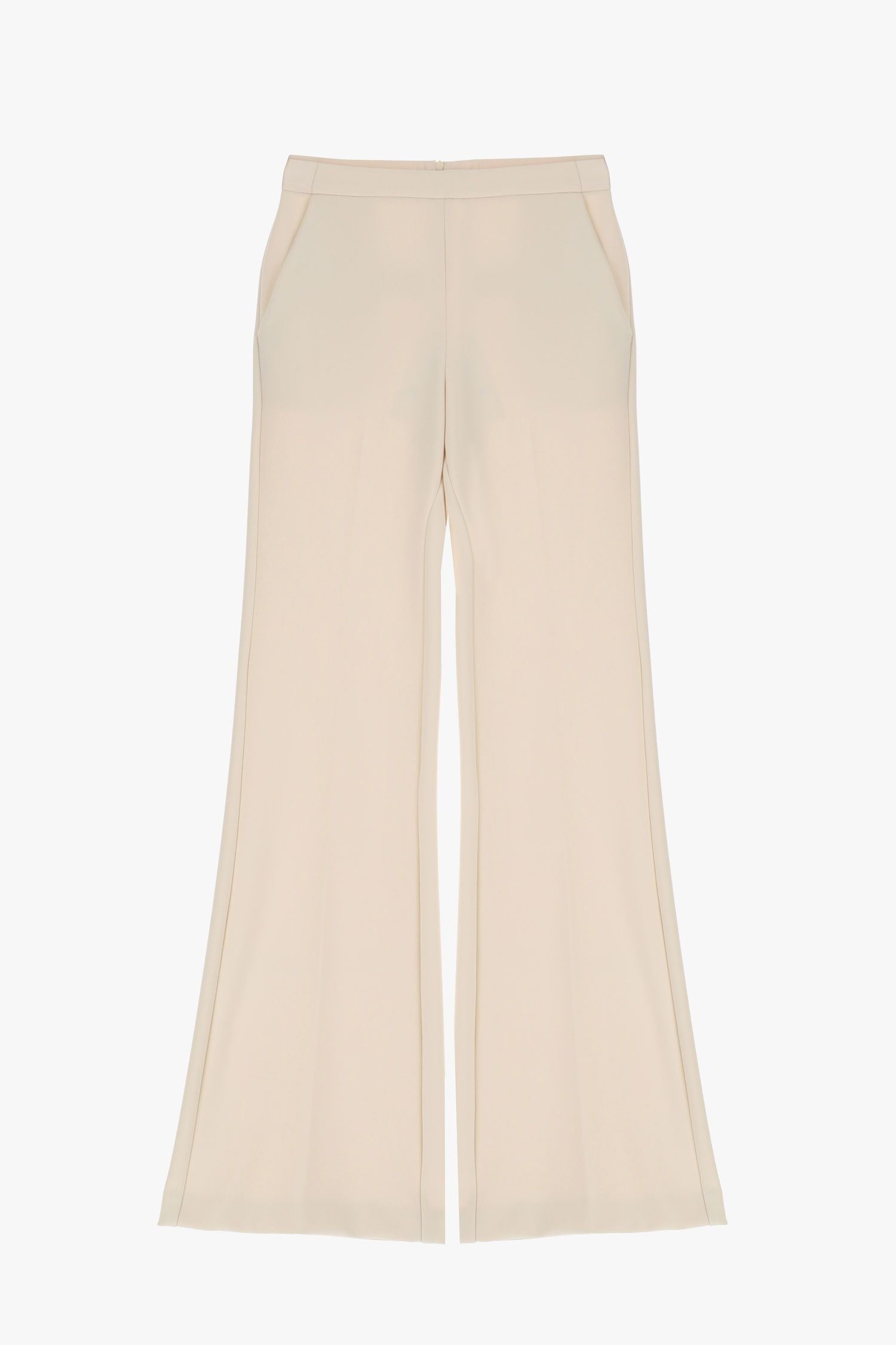 I pantaloni flare tinta unita sono dotati di vita regolare, tasche verticali e piega stirata. ART. P3E9JAW/25