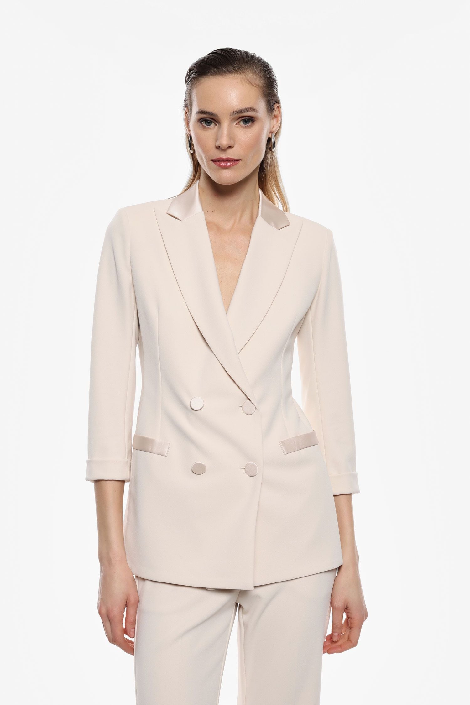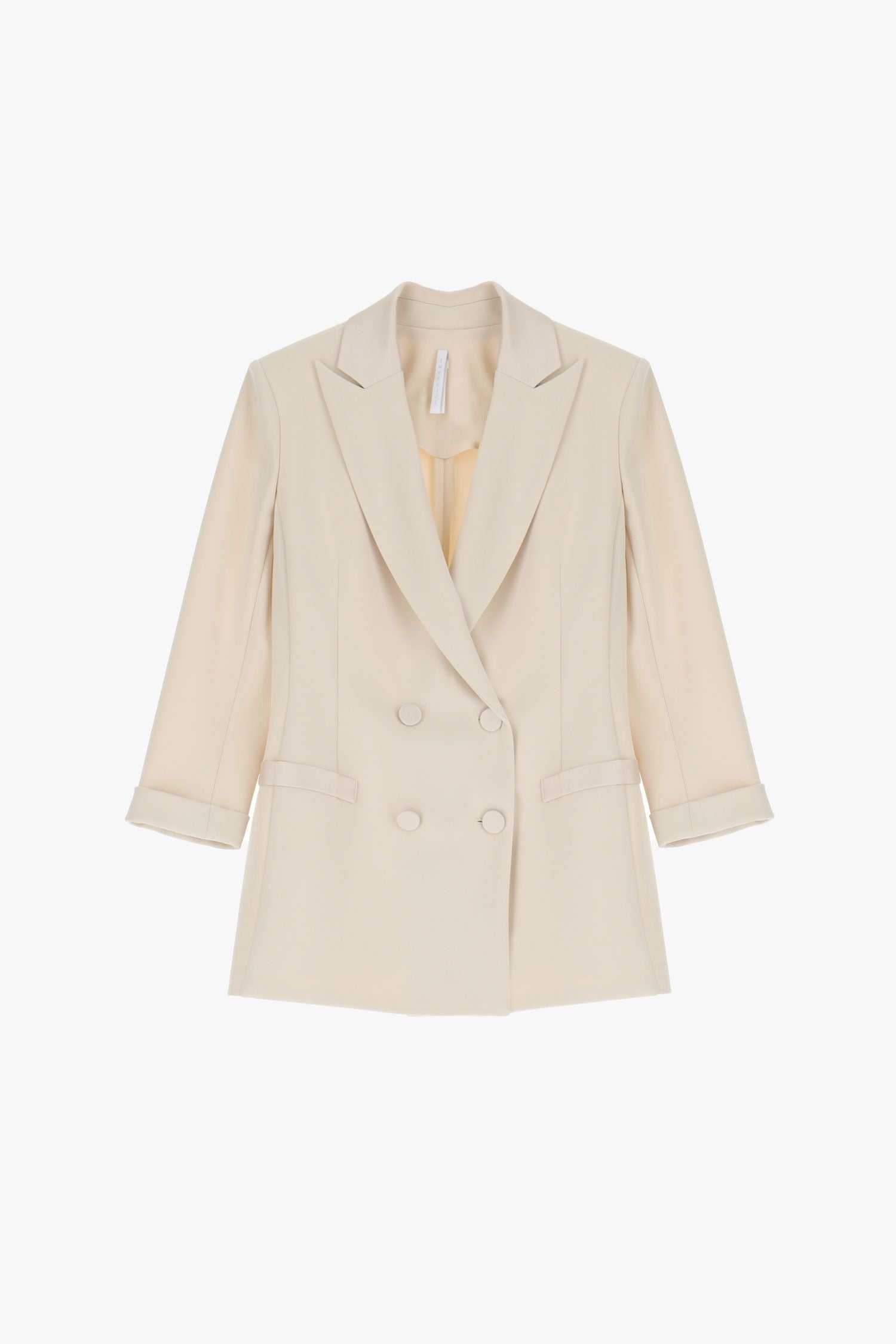 La giacca doppiopetto tinta unita è dotata da rever a lancia, bottoni tono su tono e taschini a filetto. ART. JU25JAW/25