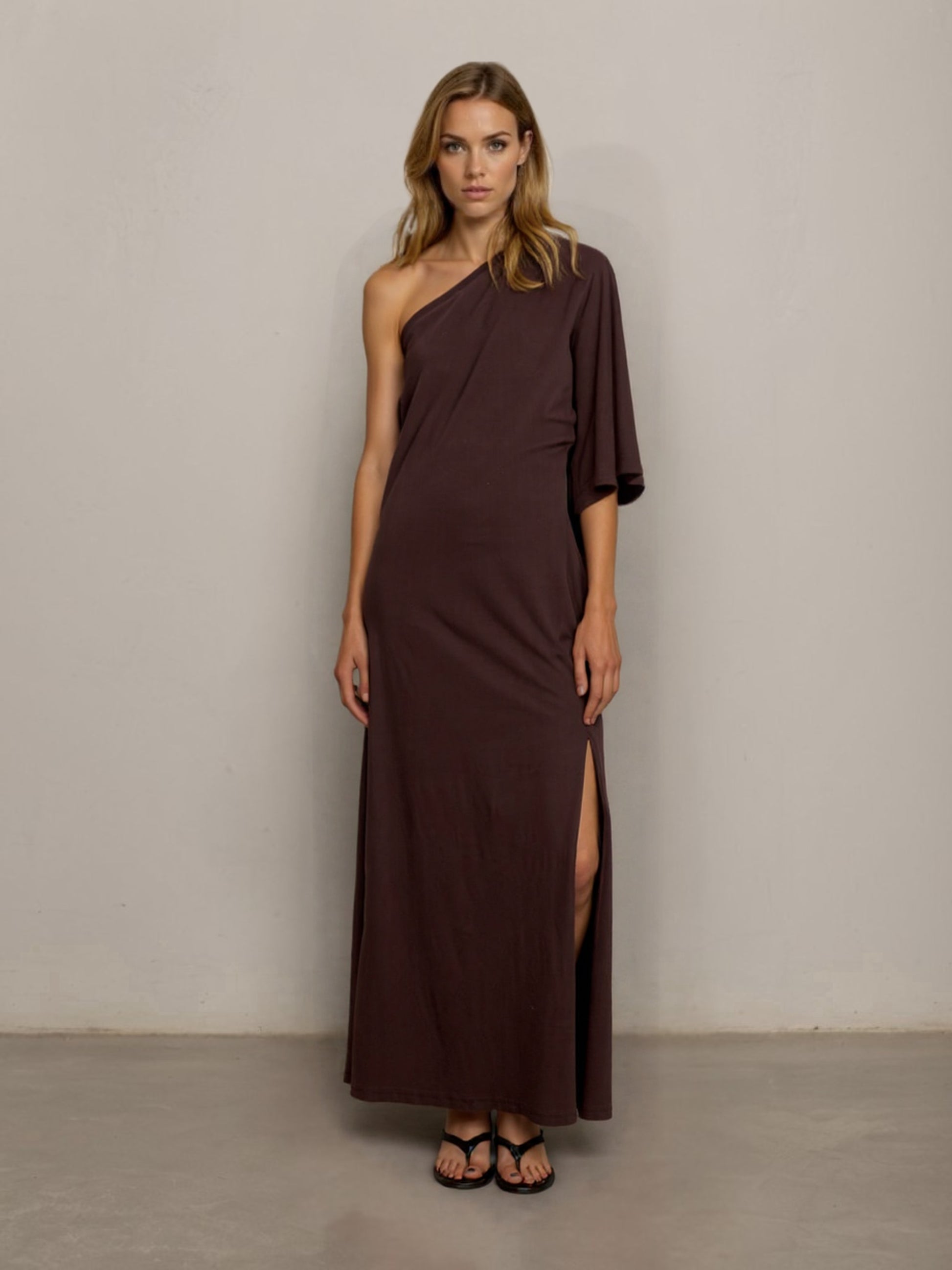 ABITO LUNGO MONOSPALLA CON SPACCO IN JERSEY DI COTONE.