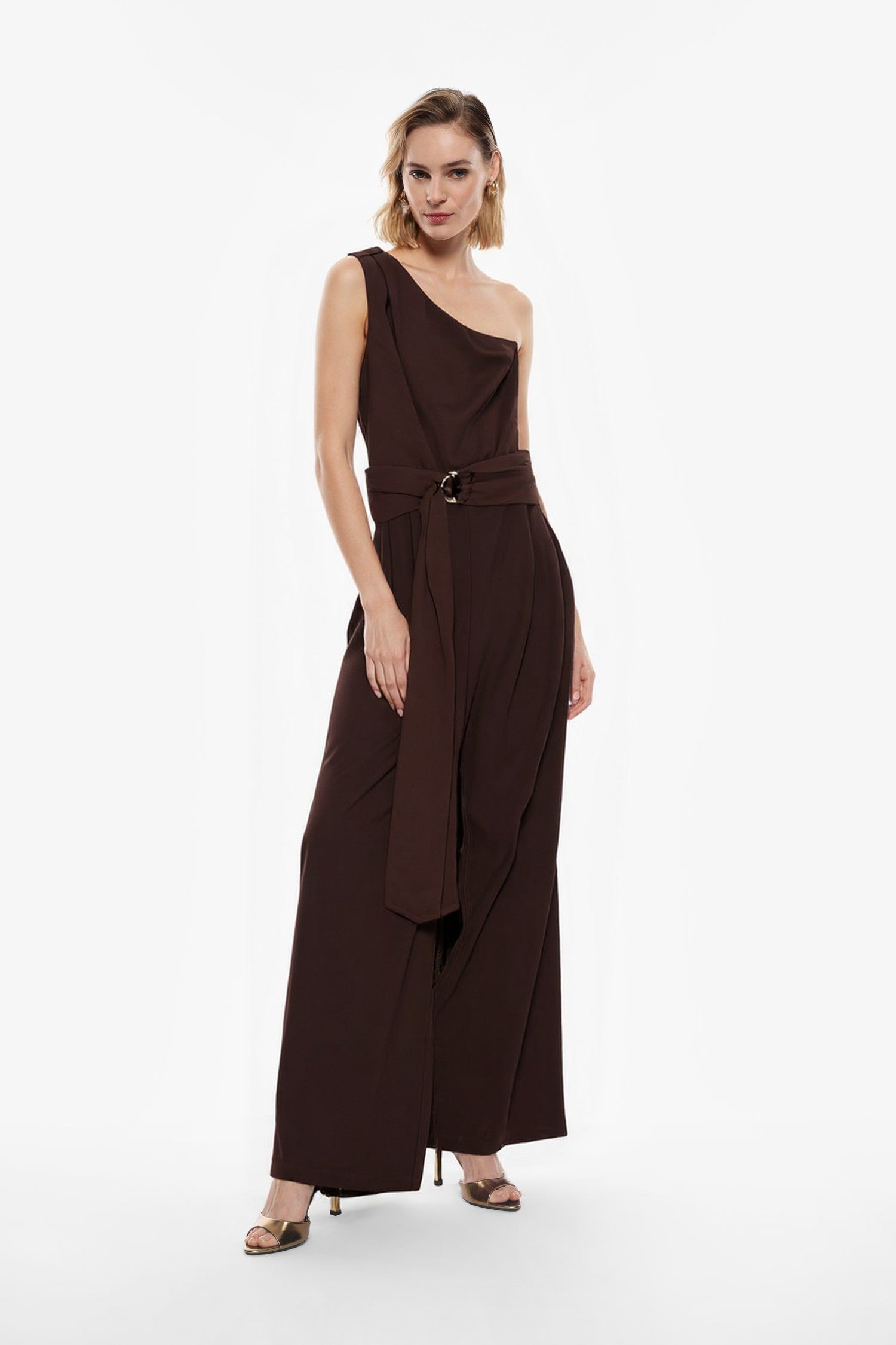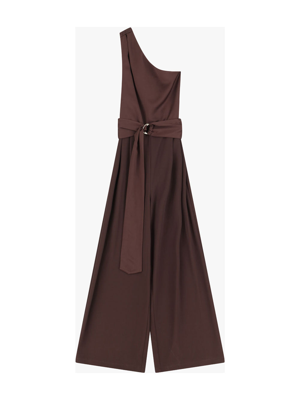 Una tuta monospalla che incanta con la sua silhouette fluida e sofisticata. La cintura avvolgente valorizza la figura, mentre il design asimmetrico regala un tocco di audacia. Ideale per eventi serali o occasioni speciali, trasformando ogni passo in un momento di autentico stile metropolitano.